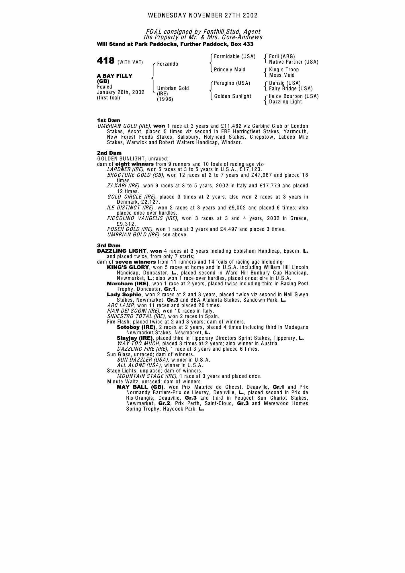 Consignor: Fonthill Stud, Agent