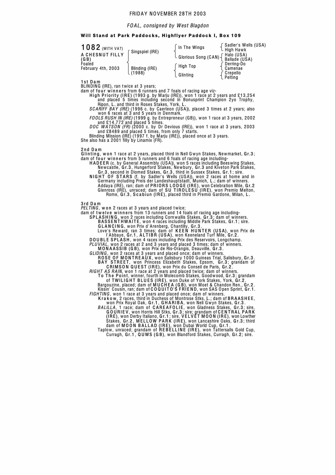 December Foal Sale 2001 lot 769 F. by Linamix (FR) , West Blagdon=>Glidawn Stud 35,000 gns