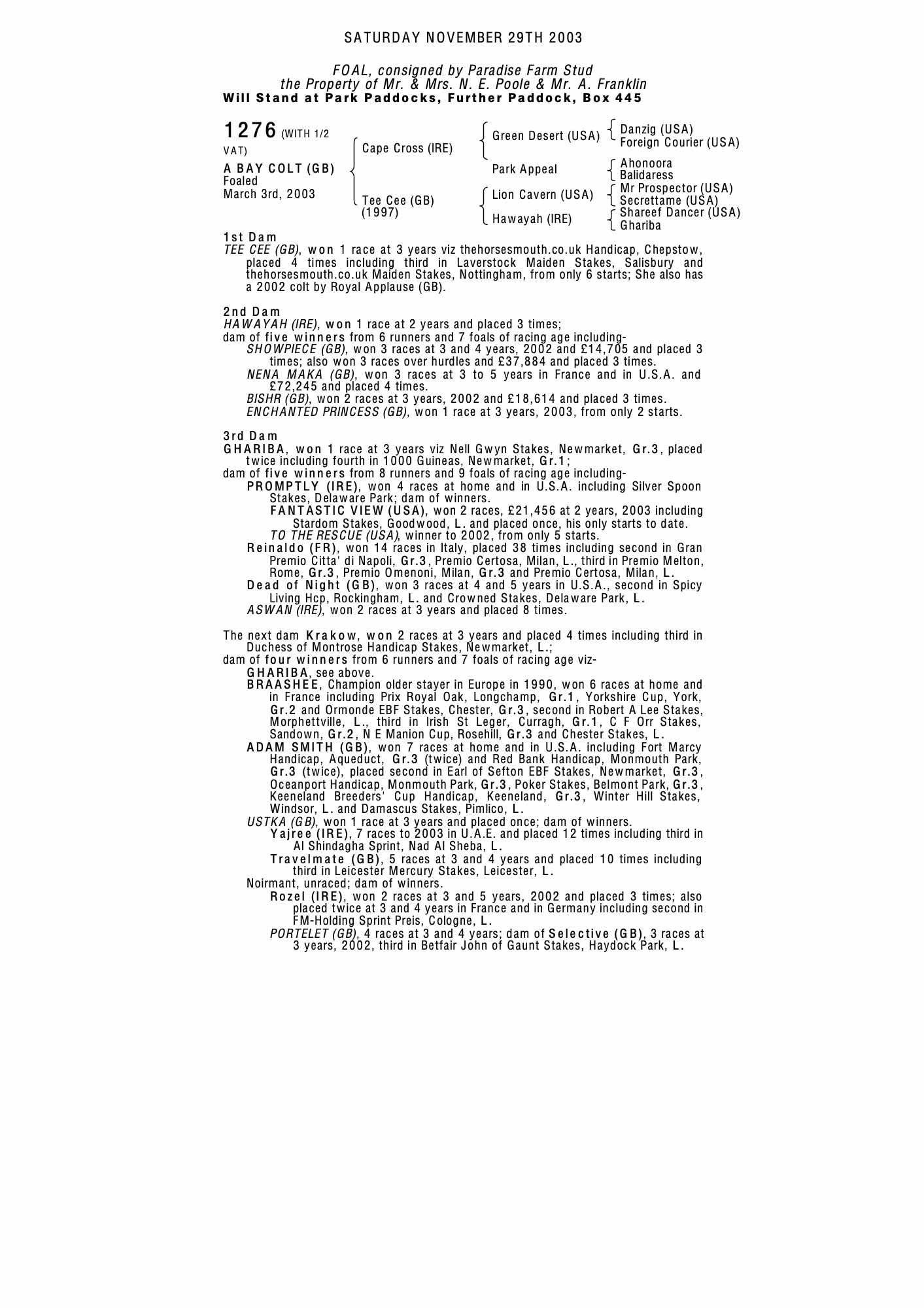 Consignor: Paradise Farm Stud
