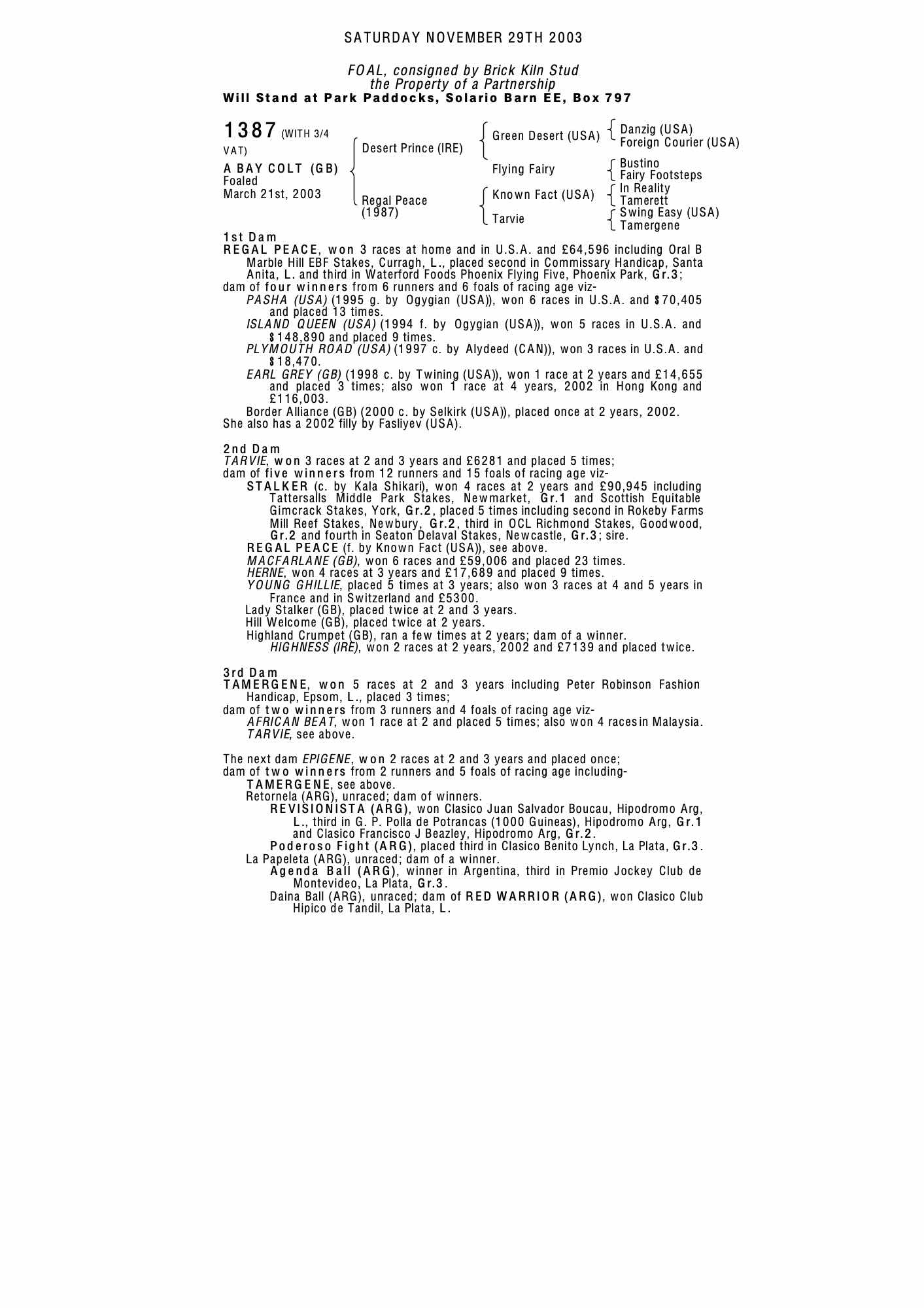 October Yearling Sale, Book 1 2003 lot 43 F. by Fasliyev (USA) 2002, Brick Kiln Stud=>C Gordon-Watson Bloodstock 60,000 gns