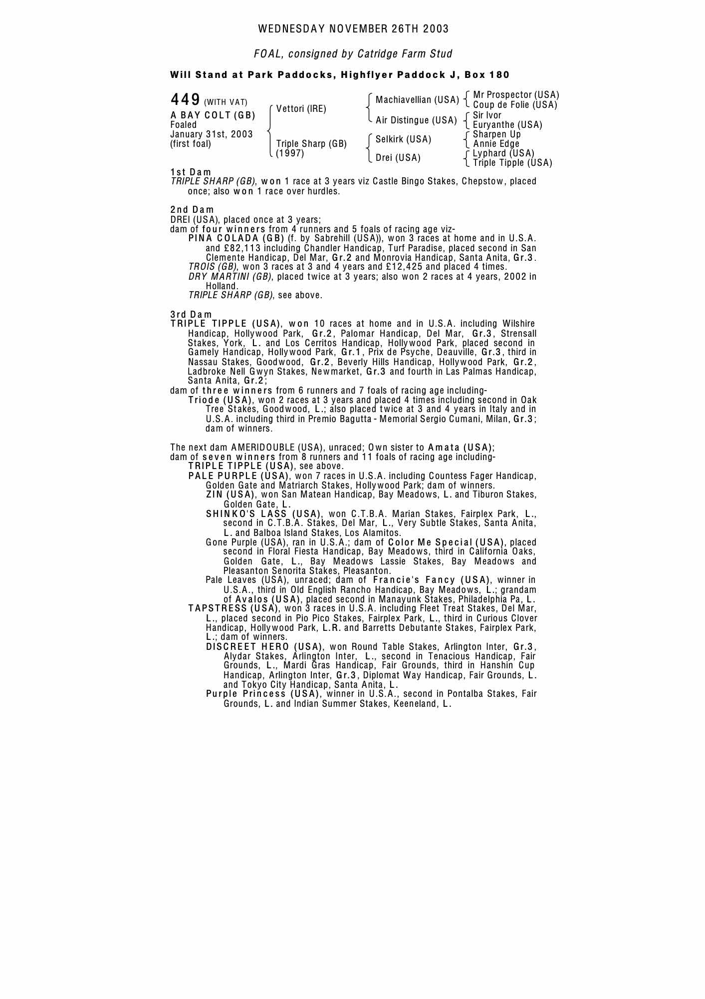 Consignor: Catridge Farm Stud