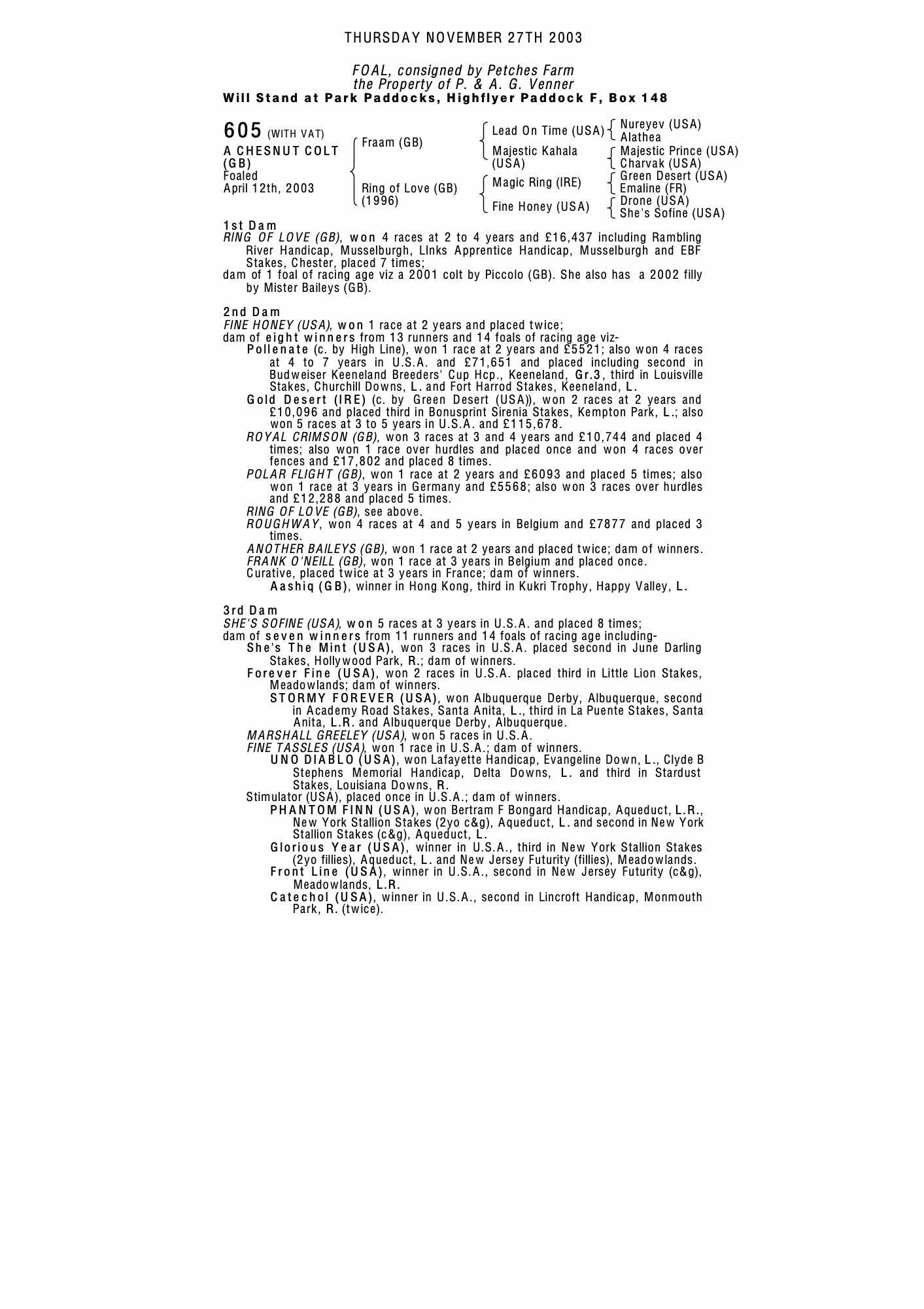 October Yearling Sale, Book 2 2003 lot 1237 F. by Mister Baileys (GB) 2002, Shefford Valley Stud=>R Guest 5,000 gns