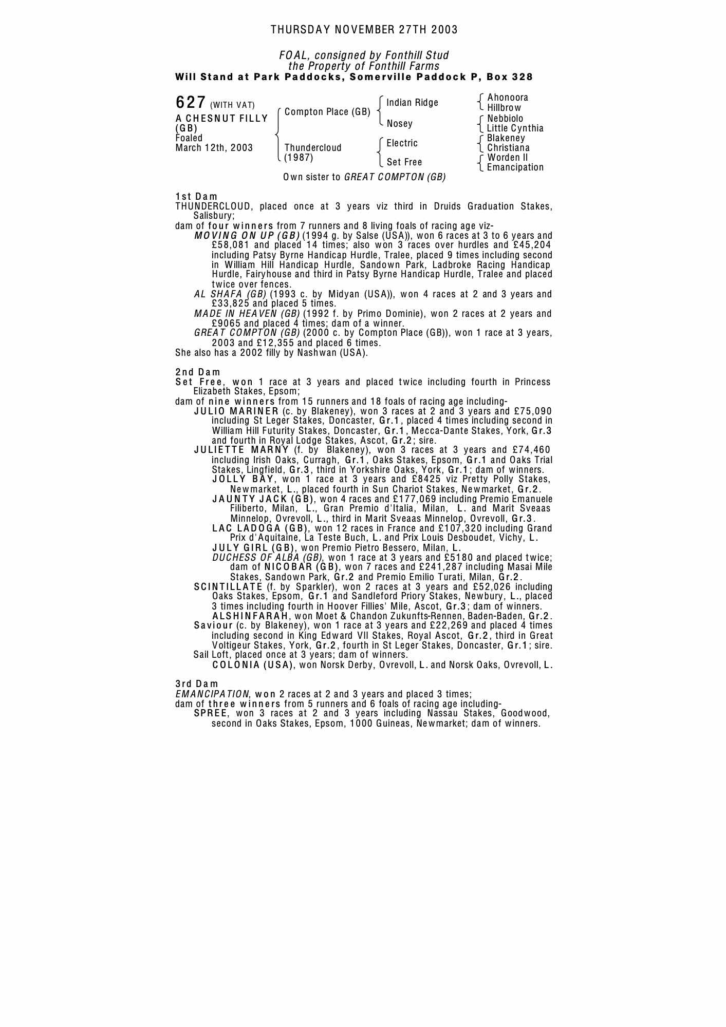 October Yearling Sale, Book 1 2003 lot 650 F. by Nashwan (USA) 2002, Fonthill Stud=>Federico Barberini, Agent 10,000 gns