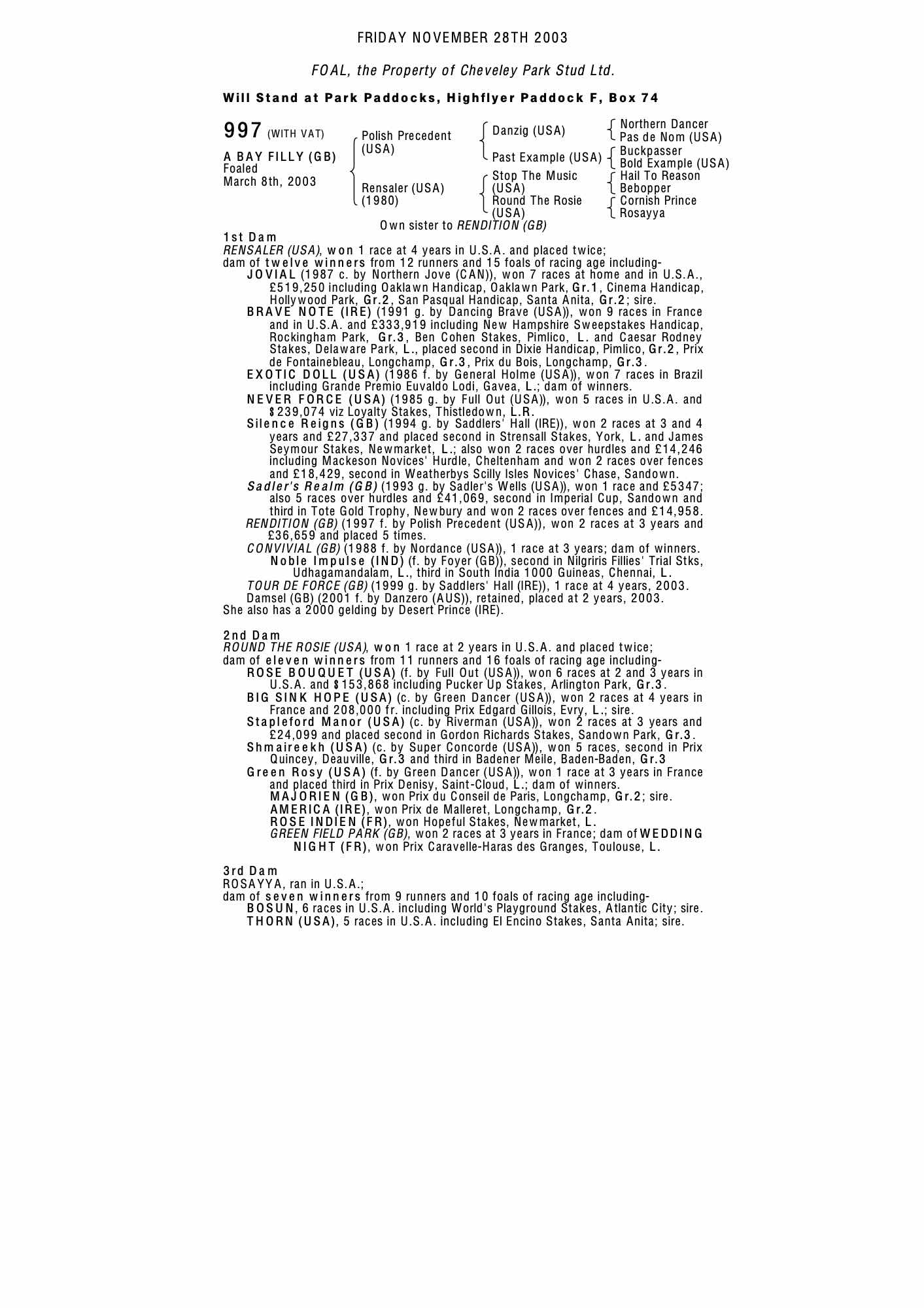 July Sale 2004 lot 73 Rendition (GB) (M.), Cheveley Park Stud Limited=>Lot Not Sold 29,000 gns