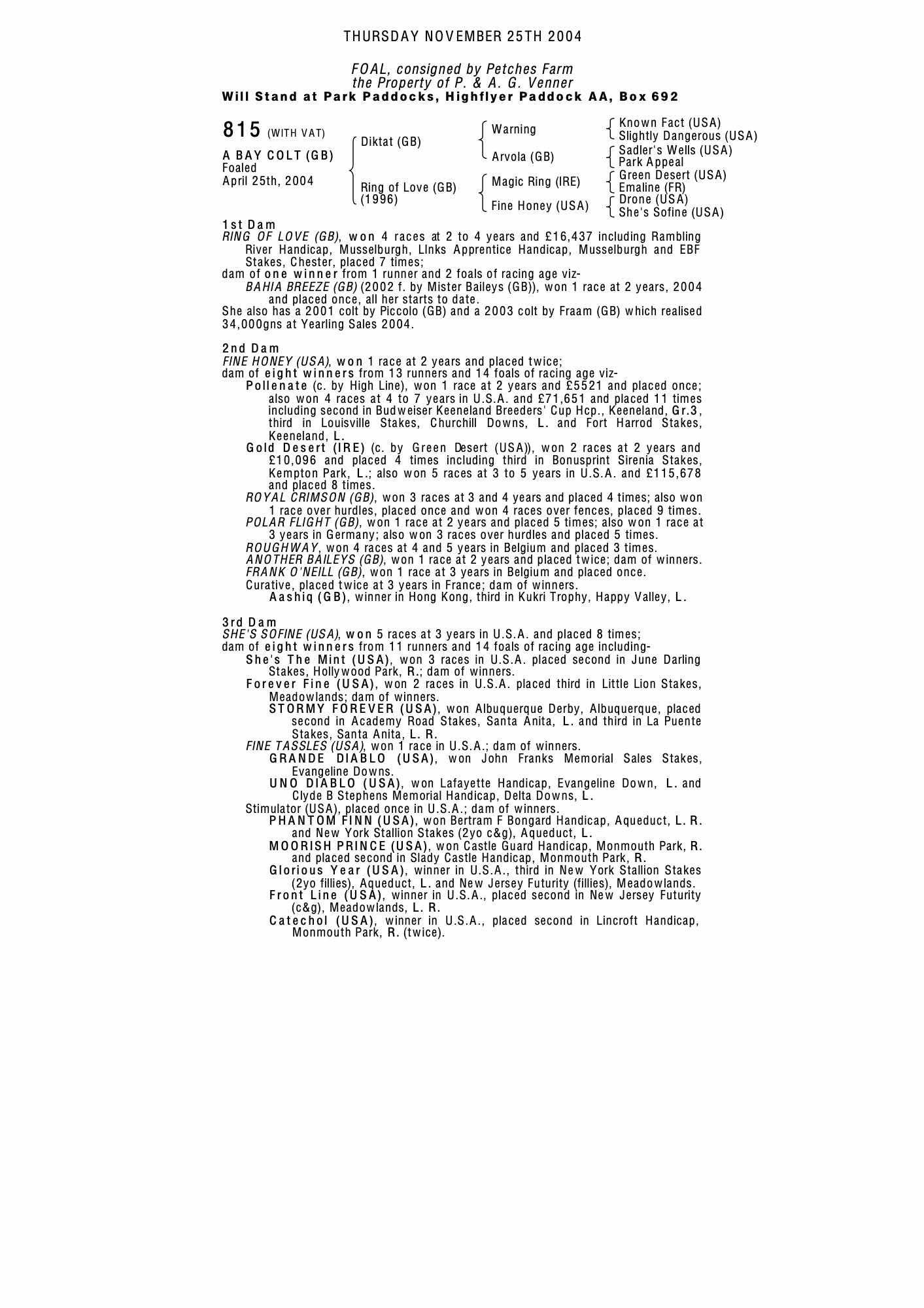 December Foal Sale 2003 lot 605 C. by Fraam (GB) 2003, Petches Farm=>Equine Services 22,000 gns
