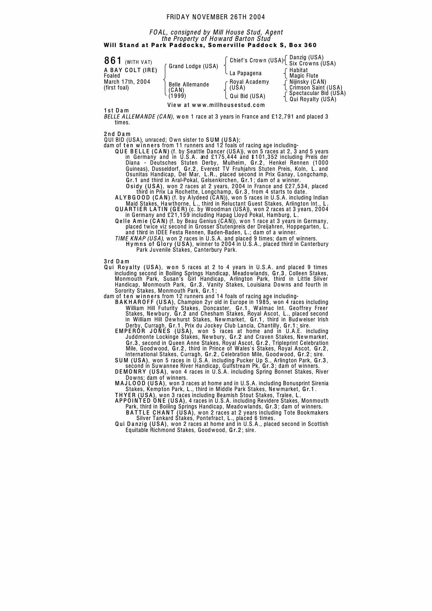 Consignor: Mill House Stud, Agent