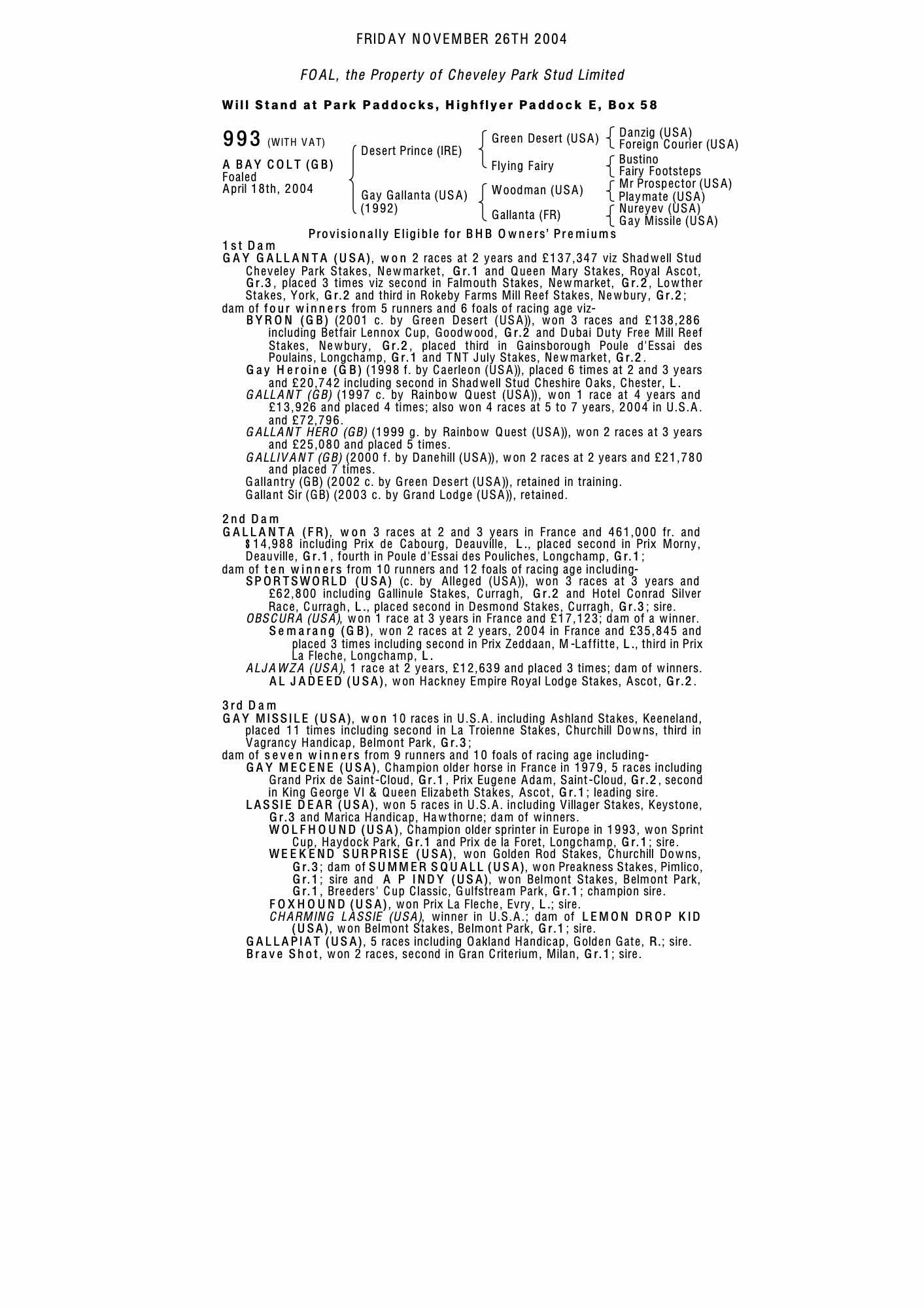 Autumn Horses in Training Sale 2005 lot 651 Gallantry (GB) (C. by Green Desert (USA)), Freemason Lodge Stables=>The Circle Bloodstock 30,000 gns