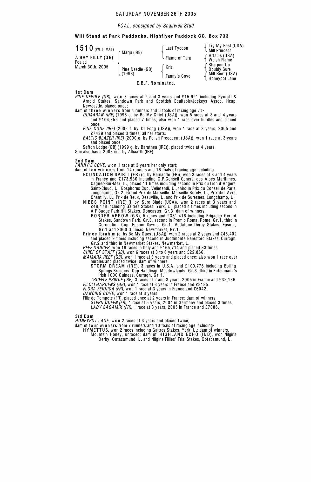 December Mare Sale 2006 lot 1450 Pine Cone (IRE) (F. by Dr Fong (USA)), Mill House Stud (Agent)=>Beliar Bloodstock 40,000 gns