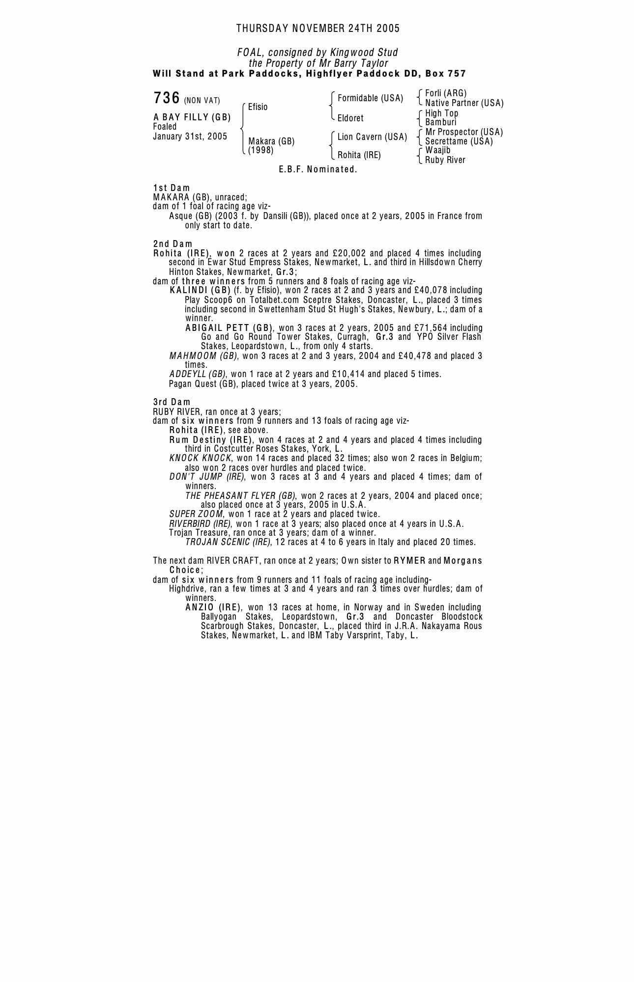 October Yearling Sale, Book 2 2004 lot 1005 F. by Dansili (GB) 2003, Kingwood Stud=>Royal Amber 20,000 gns