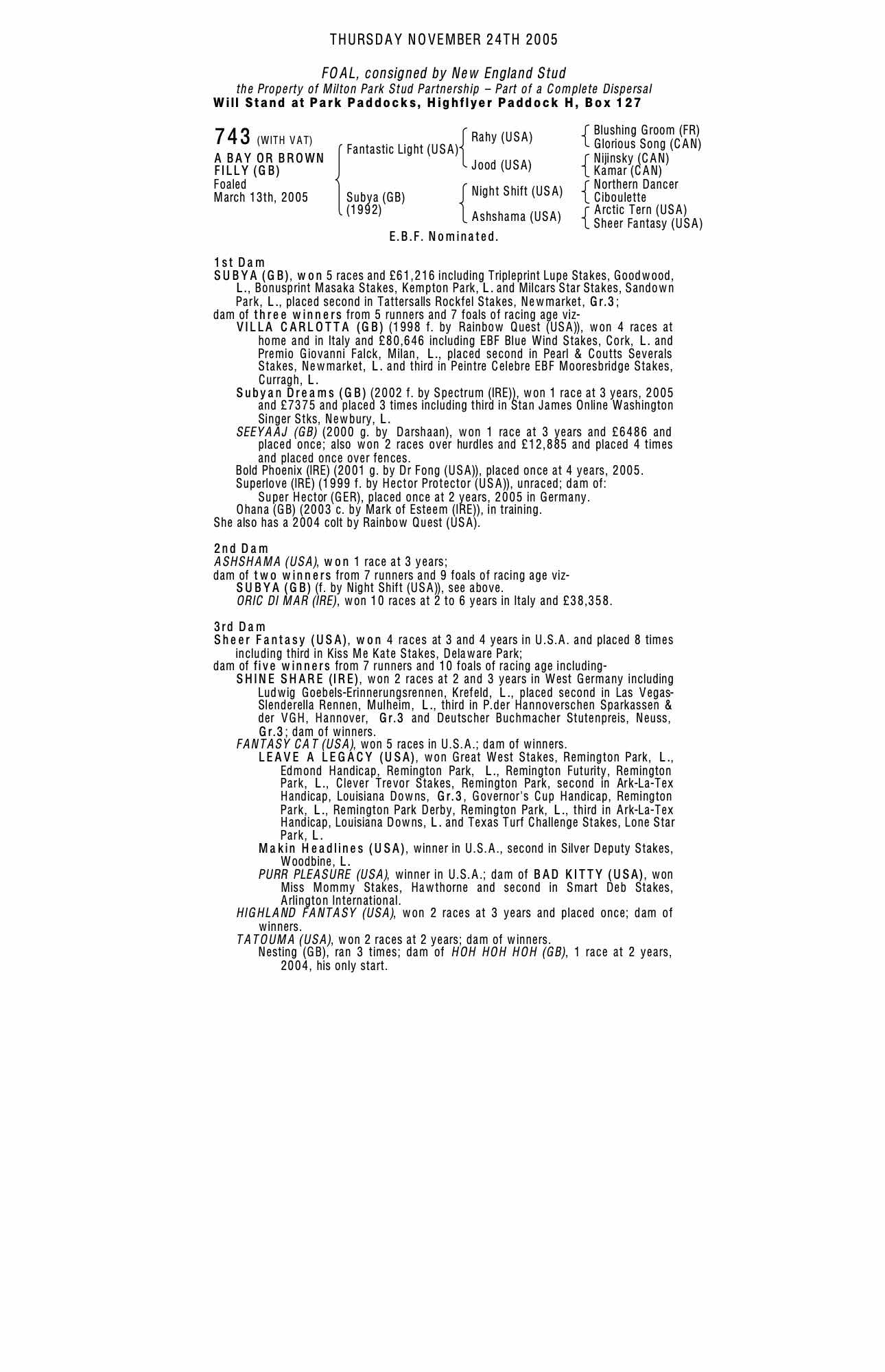July Sale 2005 lot 585 Subyan Dreams (GB) (F. by Spectrum (IRE)), St Gatien Stables=>Margaret O'Toole 50,000 gns