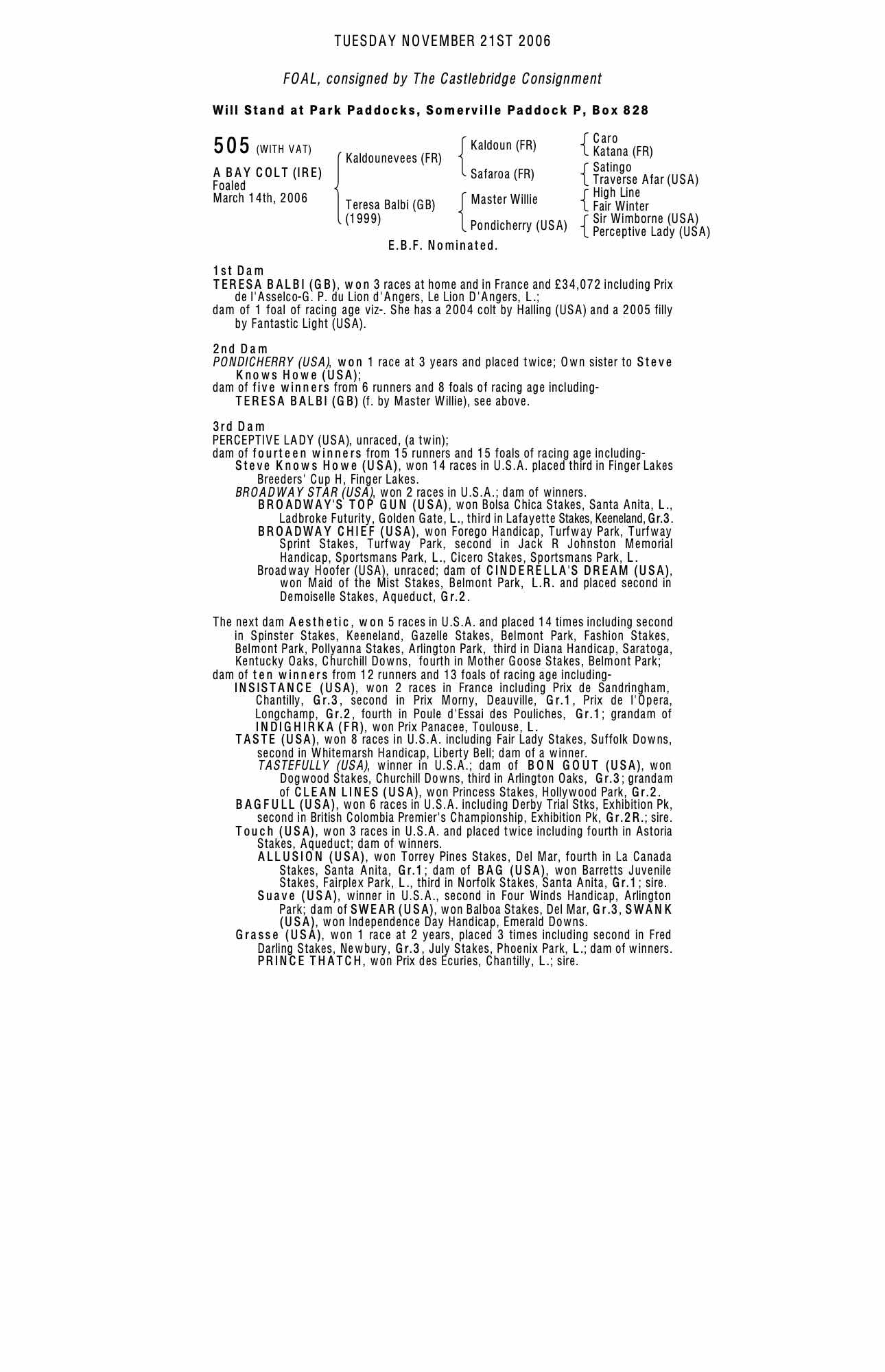 December Foal Sale 2005 lot 902 F. by Fantastic Light (USA) 2005, The Castlebridge Consignment=>Bozzi Bloodstock Services Italia 13,500 gns