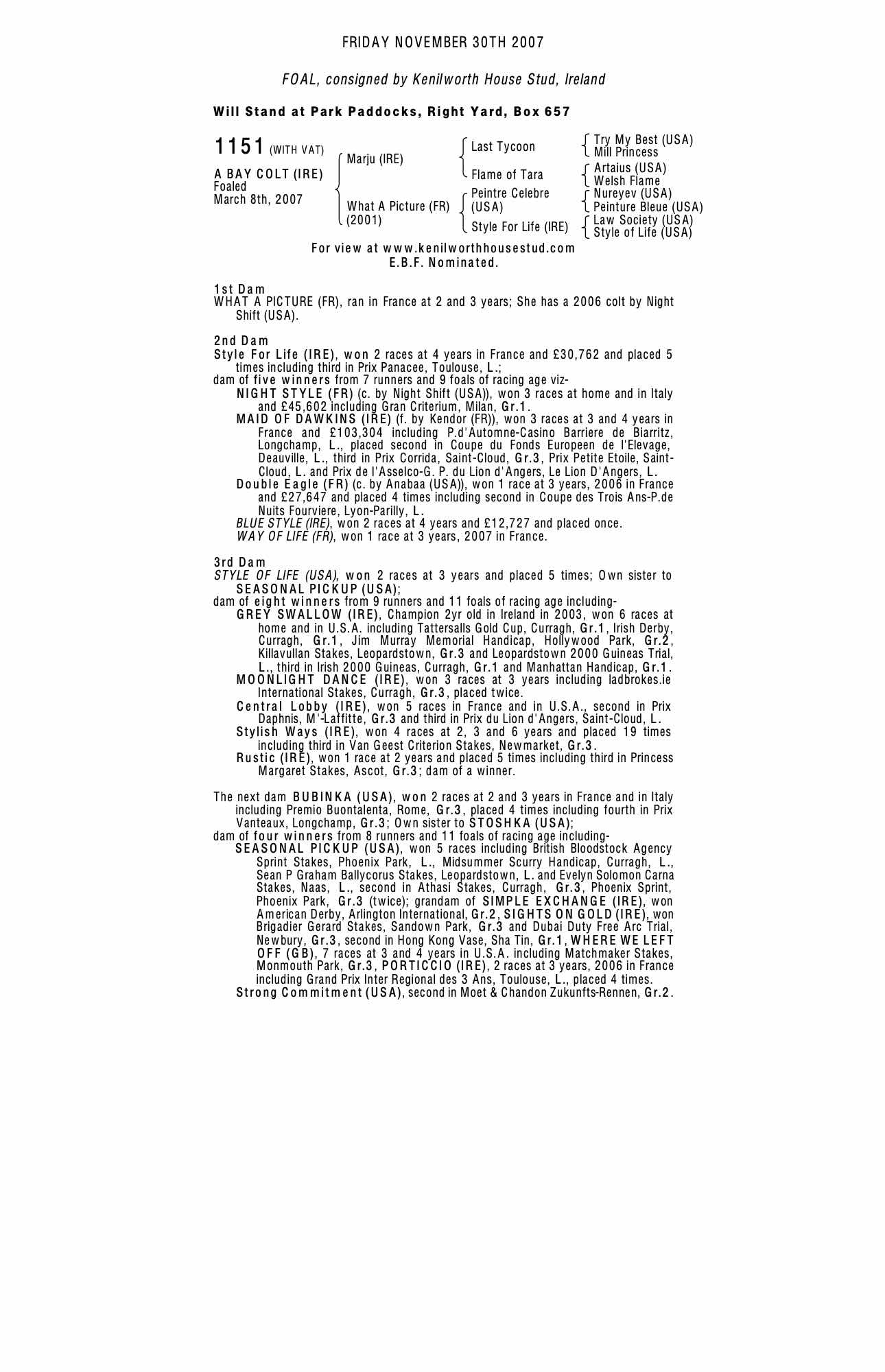 October Yearling Sale, Book 2 2008 lot 1041, Meadowlands Stud, Ireland=>Shadwell Estate Company 170,000 gns