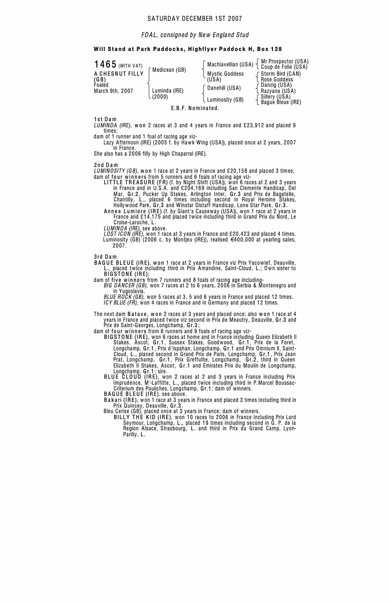 October Yearling Sale, Book 2 2007 lot 842 F. by High Chaparral (IRE) 2006, New England Stud=>Allan Bloodlines 30,000 gns