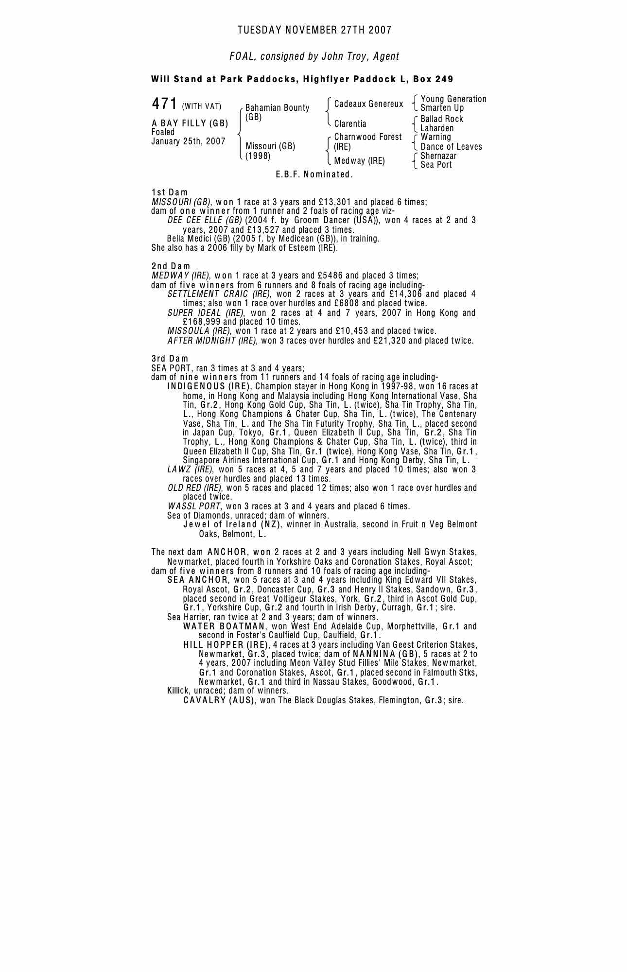 October Yearling Sale, Book 1 2007 lot 196 F. by Mark of Esteem (IRE) 2006, John Troy, Agent=>Ken Snell 20,000 gns
