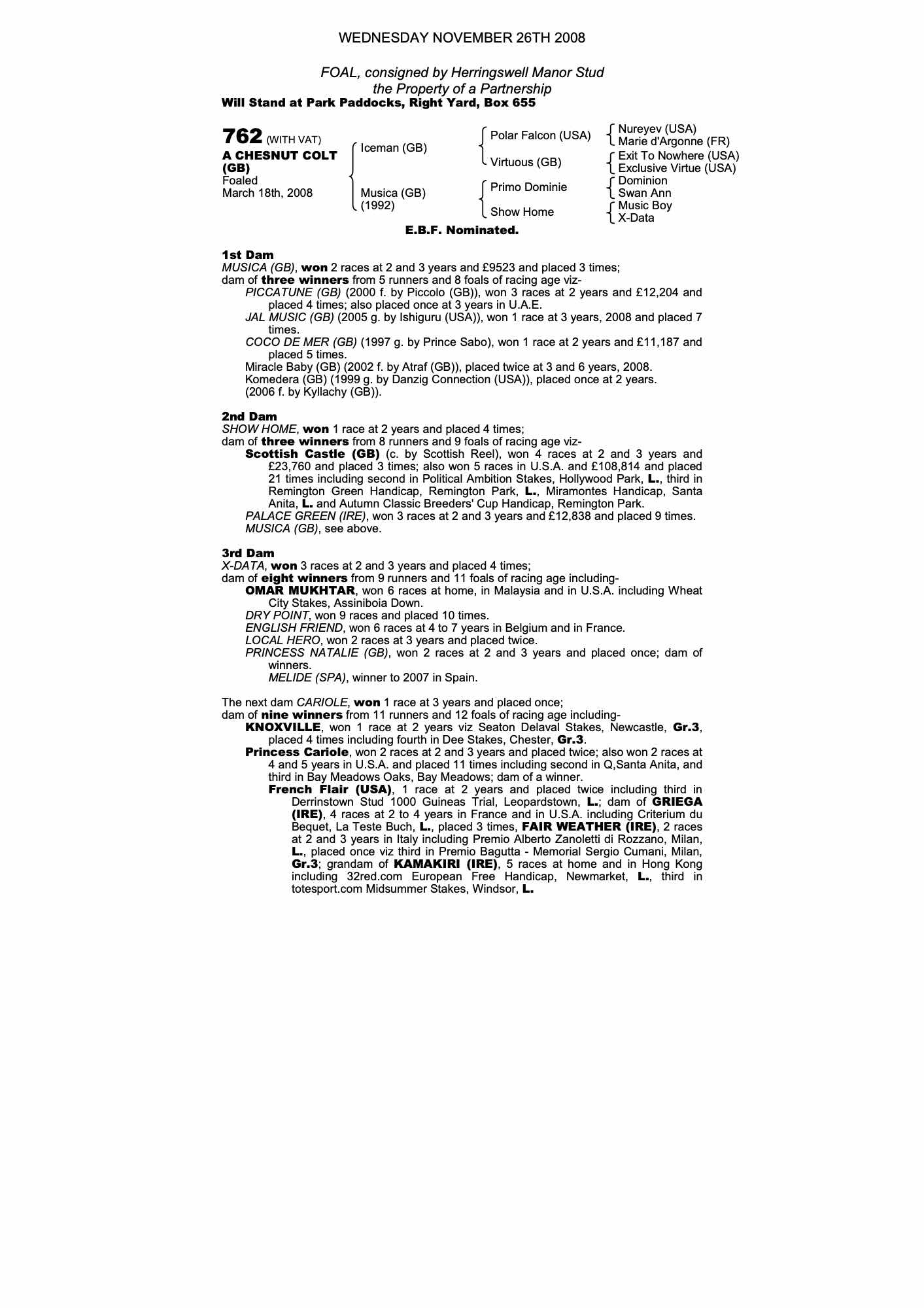 October Yearling Sale, Book 3 2009 lot 1943 C. 2008, Herringswell Manor Stud=>PJ McBride 800 gns