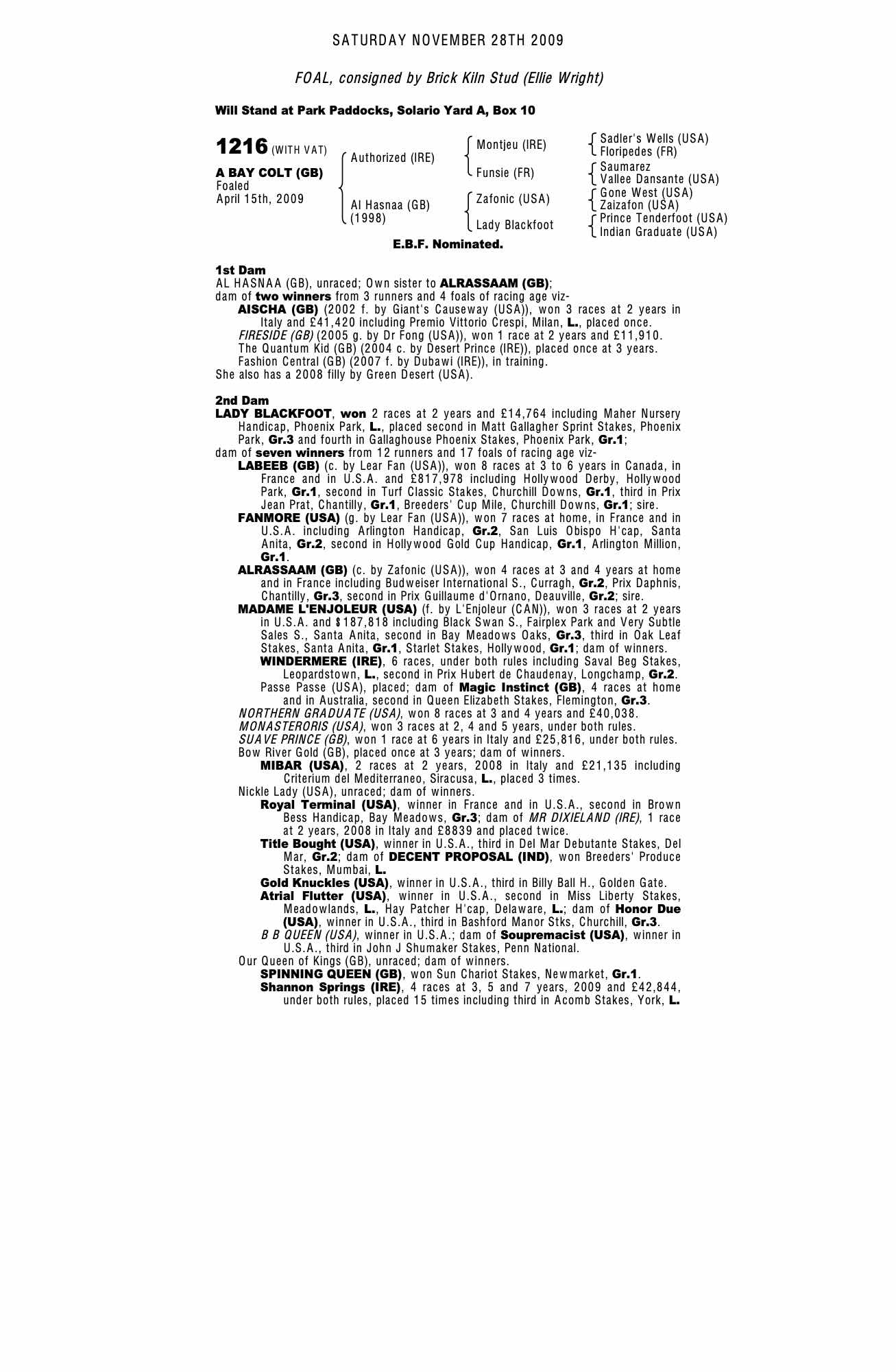 October Yearling Sale, Book 1 2009 lot 202 F. by Green Desert (USA) 2008, Hawthorn Villa Stud, Ireland=>John Ferguson Bloodstock 260,000 gns