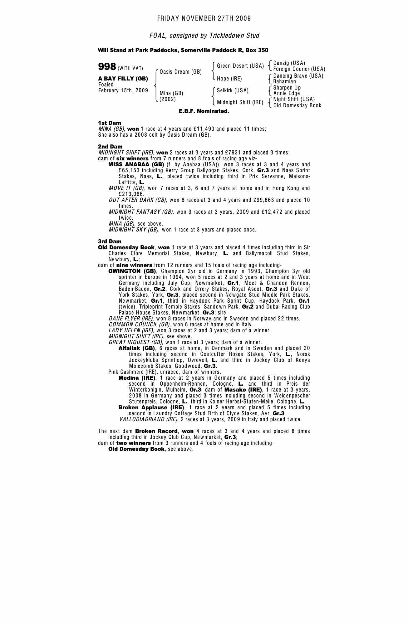 October Yearling Sale, Book 1 2009 lot 578 C. 2008, Yeomanstown Stud, Ireland=>R O'Gorman Bloodstock 150,000 gns