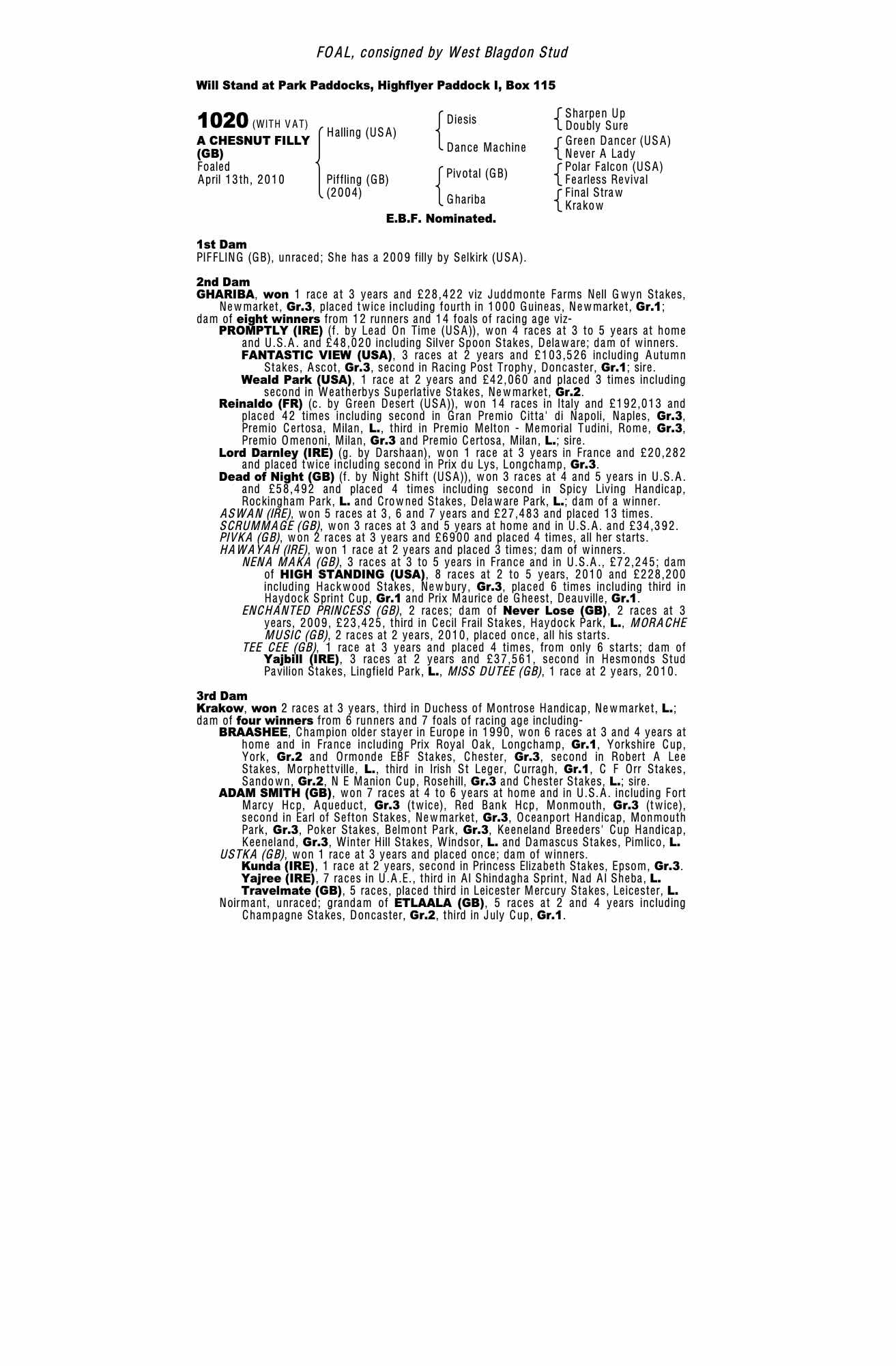 Consignor: West Blagdon Stud