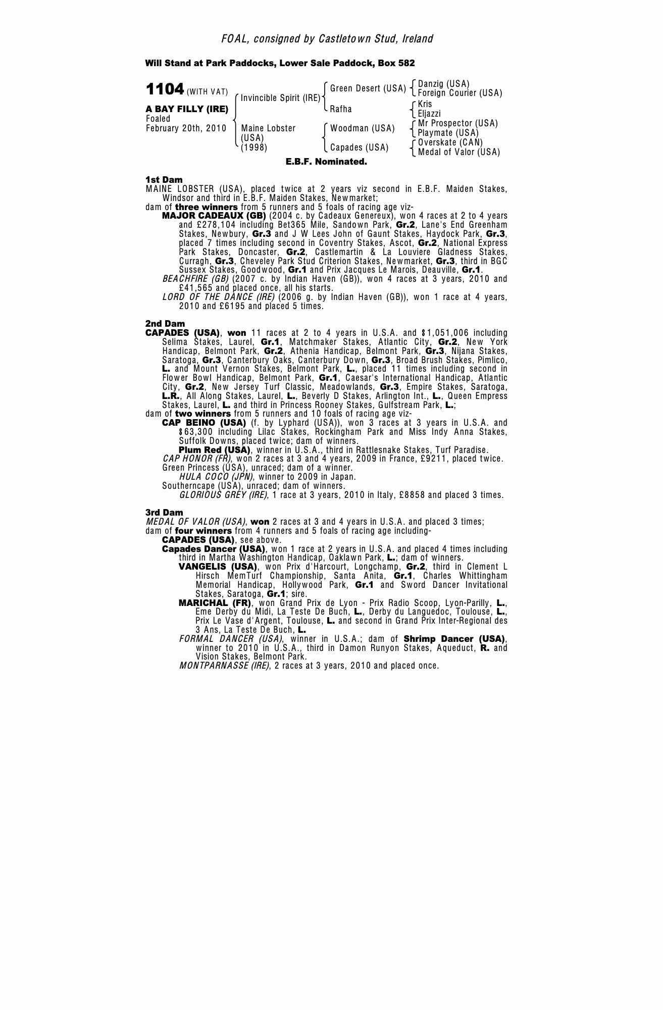 Wednesday 10 November:  Under 1st Dam: LORD OF THE DANCE, winner of 2 races