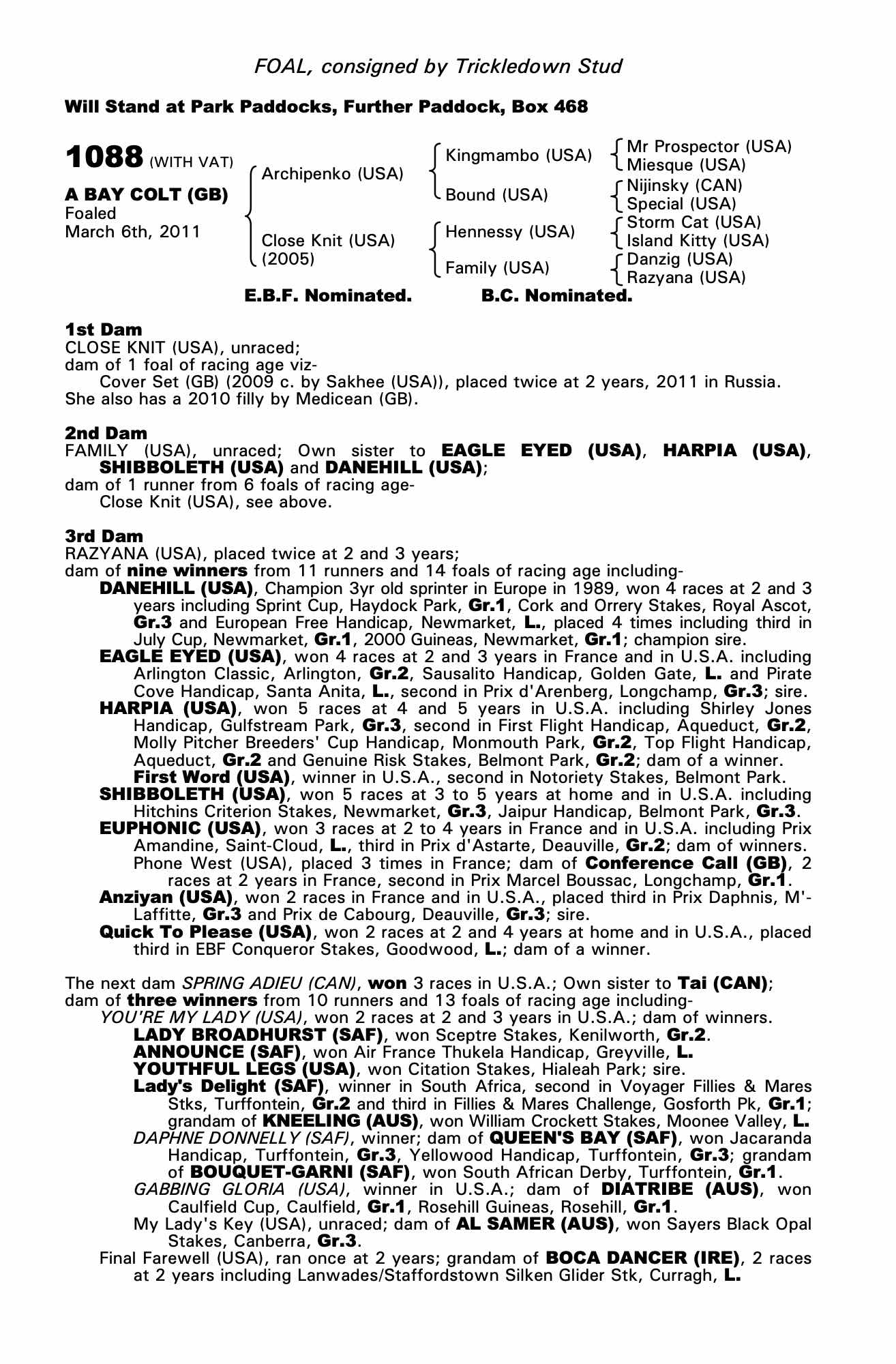 December Foal Sale 2010 lot 1097 F. by Medicean (GB) 2010, Trickledown Stud=>Ladyship Lodge 12,000 gns