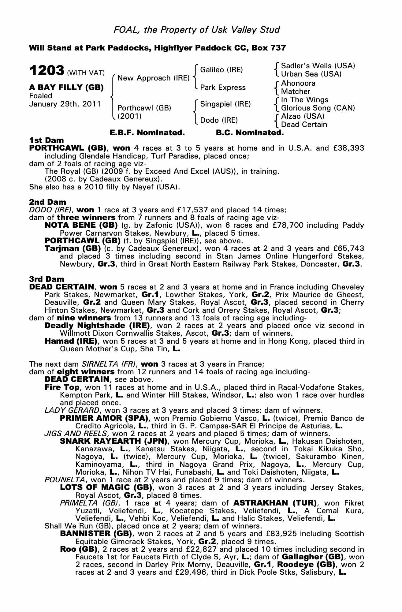 October Yearling Sale, Book 2 2011 lot 981 F. by Nayef (USA) 2010, Usk Valley Stud=>A Brambilla 6,000 gns