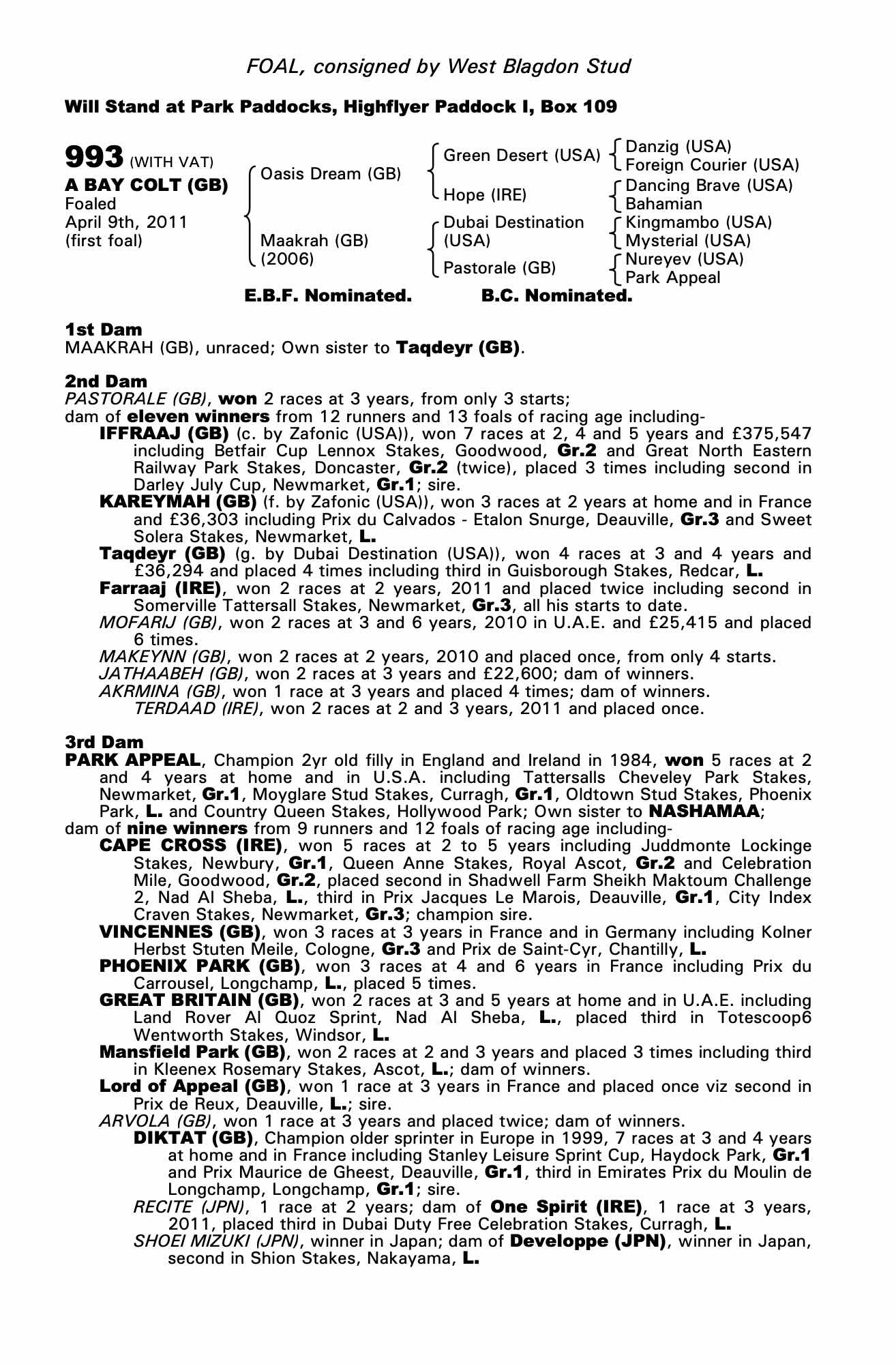 December Foal Sale 2014 lot 1095 F. by Invincible Spirit (IRE) 2014, West Blagdon Stud=>Norris/Huntingdon 130,000 gns