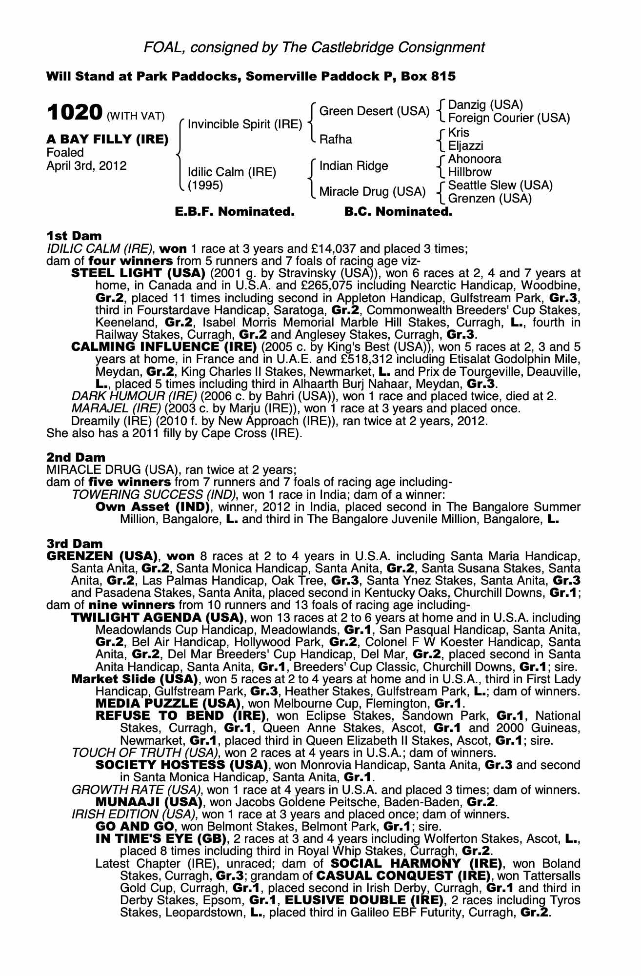 Invincible Spirit (IRE) / Idilic Calm (IRE) B.F. (IRE)