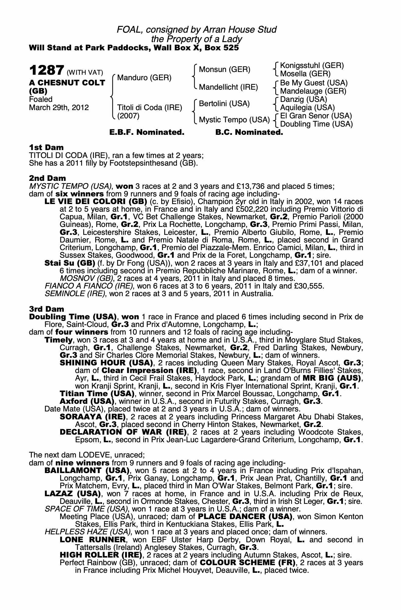 Consignor: Arran House Stud