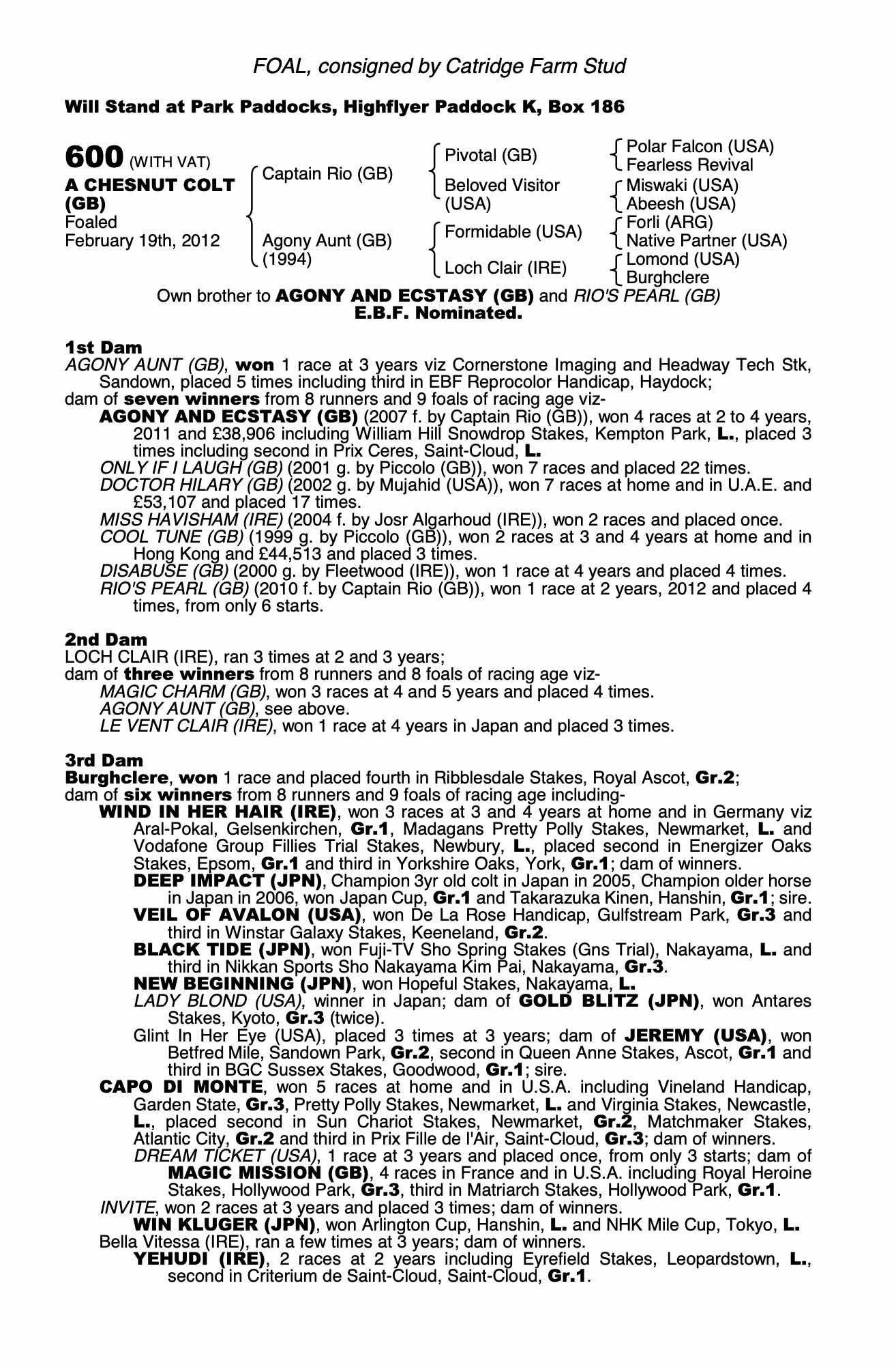 Consignor: Catridge Farm Stud