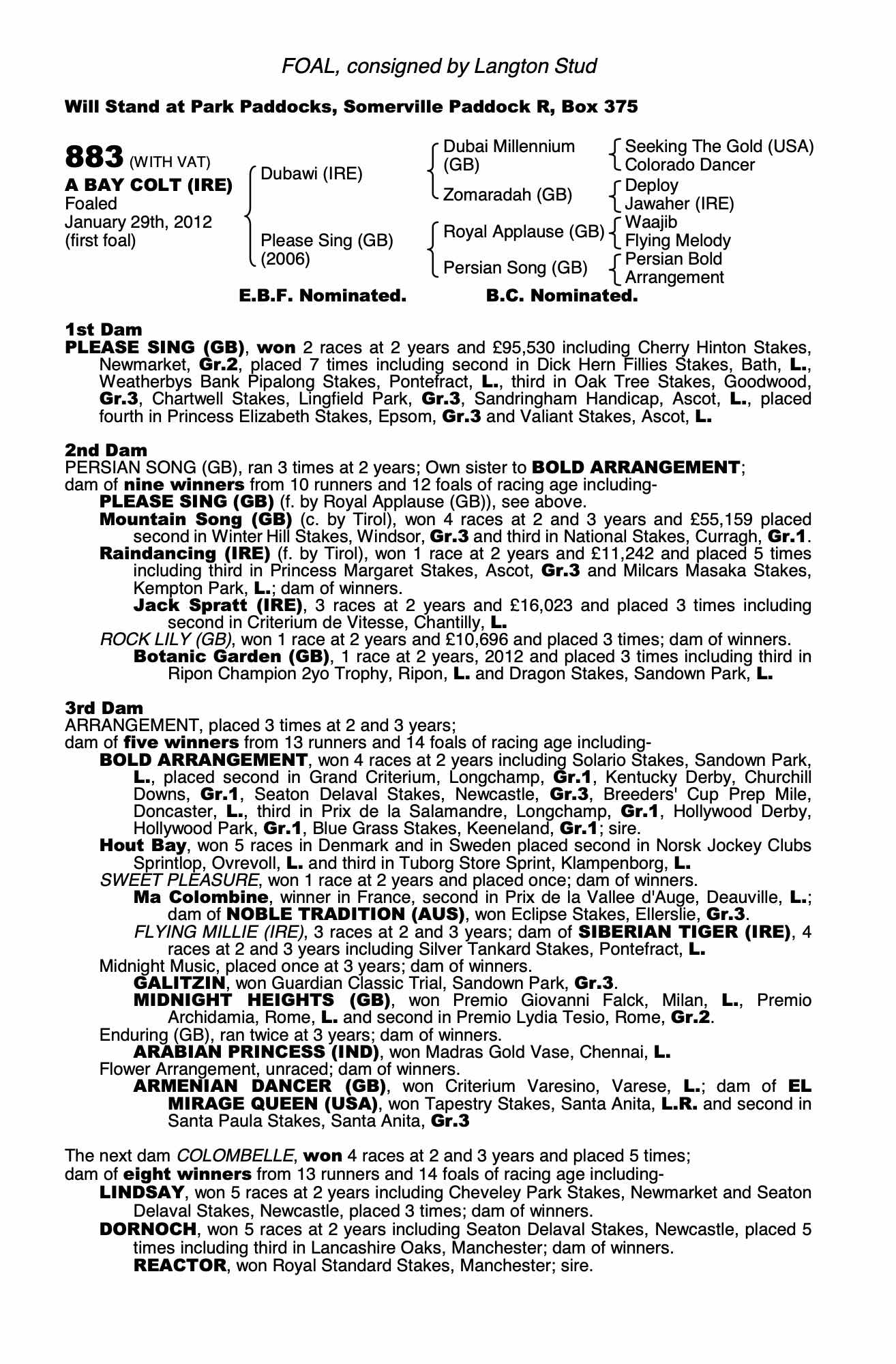 December Foal Sale 2013 lot 878 F. by Invincible Spirit (IRE) 2013, Langton Stud=>One Agency 120,000 gns