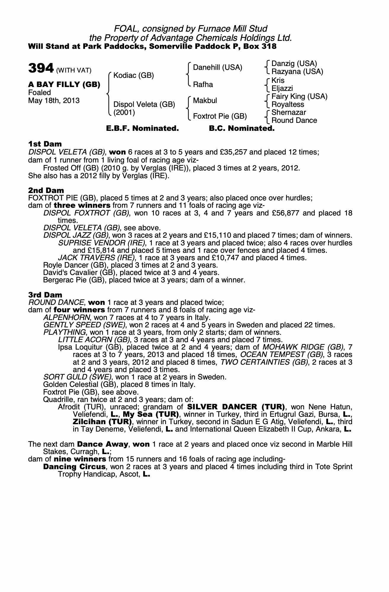 October Yearling Sale, Book 3 2013 lot 1704 F. by Verglas (IRE) 2012, Furnace Mill Stud=>Vendor 8,000 gns