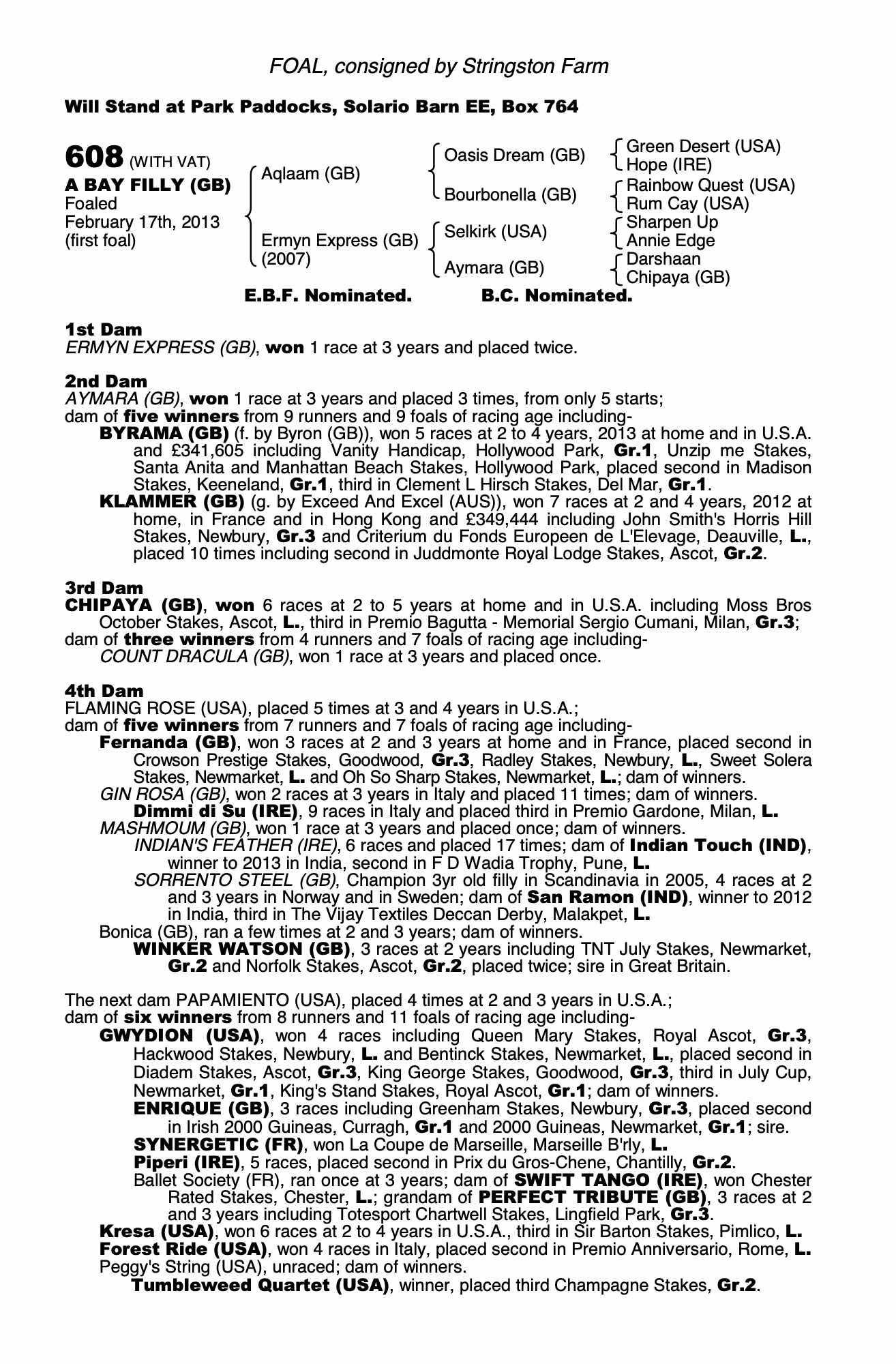 December Foal Sale 2014 lot 882 F. by Excelebration (IRE) 2014, Stringston Farm=>Vendor 20,000 gns