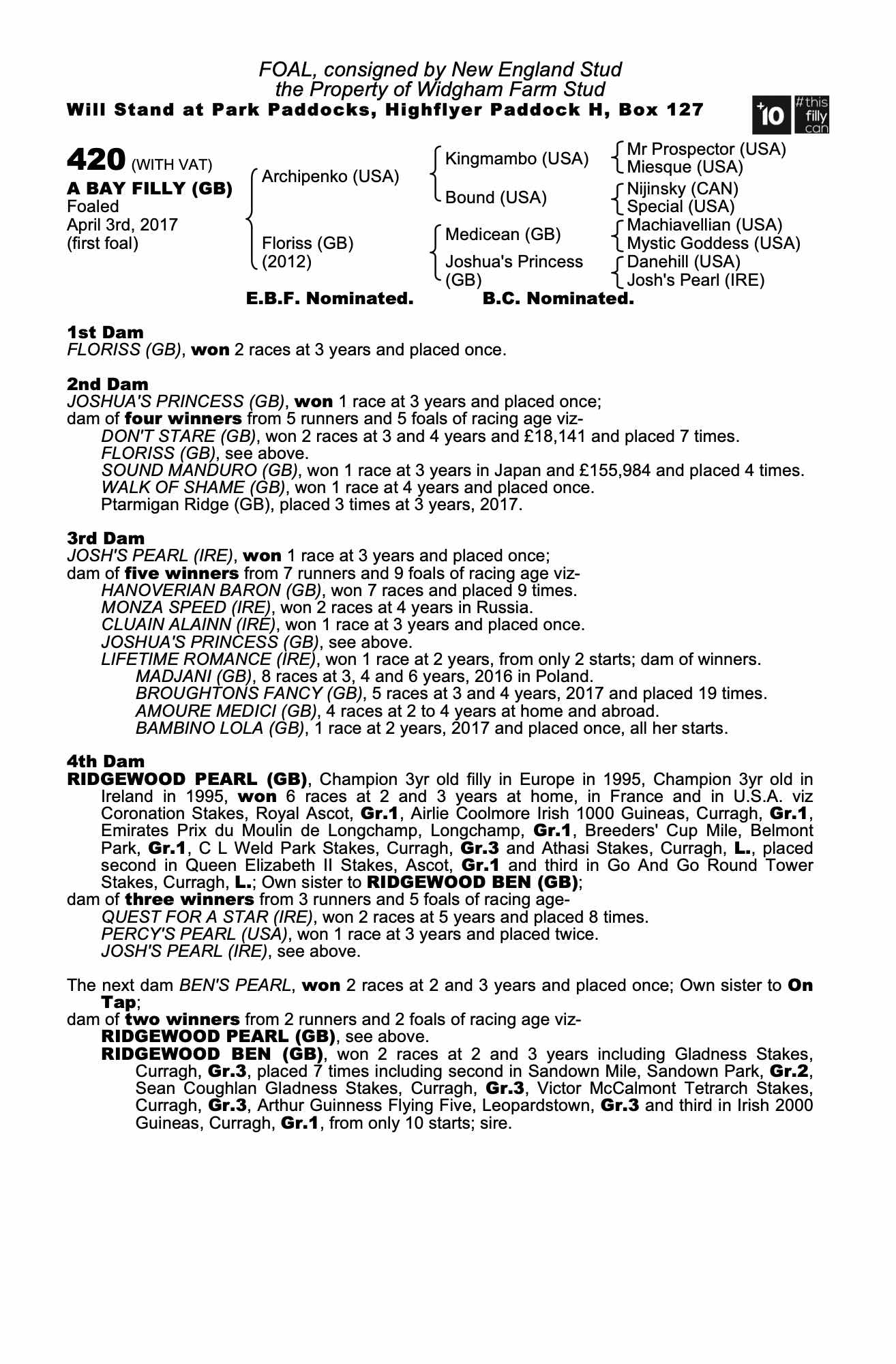 2nd Dam JOSHUA'S PRINCESS (GB); dam of five winners including PTARMIGAN RIDGE (GB), won 1 race at 3 years, 2017. She also has a 2016 filly by Nathaniel (IRE), which realised 100,000gns at Tattersalls October Yearling Sales, Book 2, 2017.
