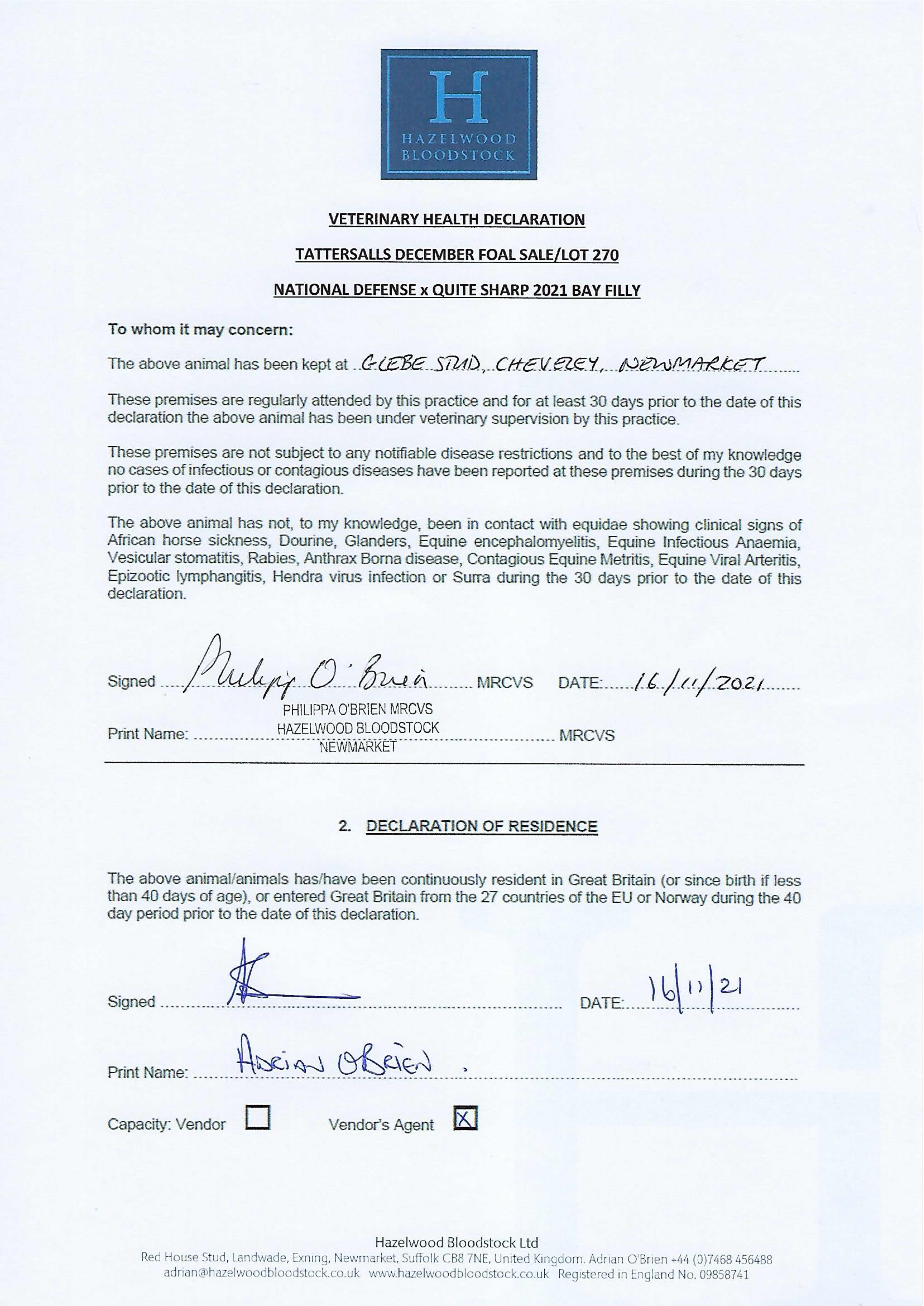 Contact: Adrian O'Brien ✆ +447468456488 ✉ adrian@hazelwoodbloodstock.co.uk