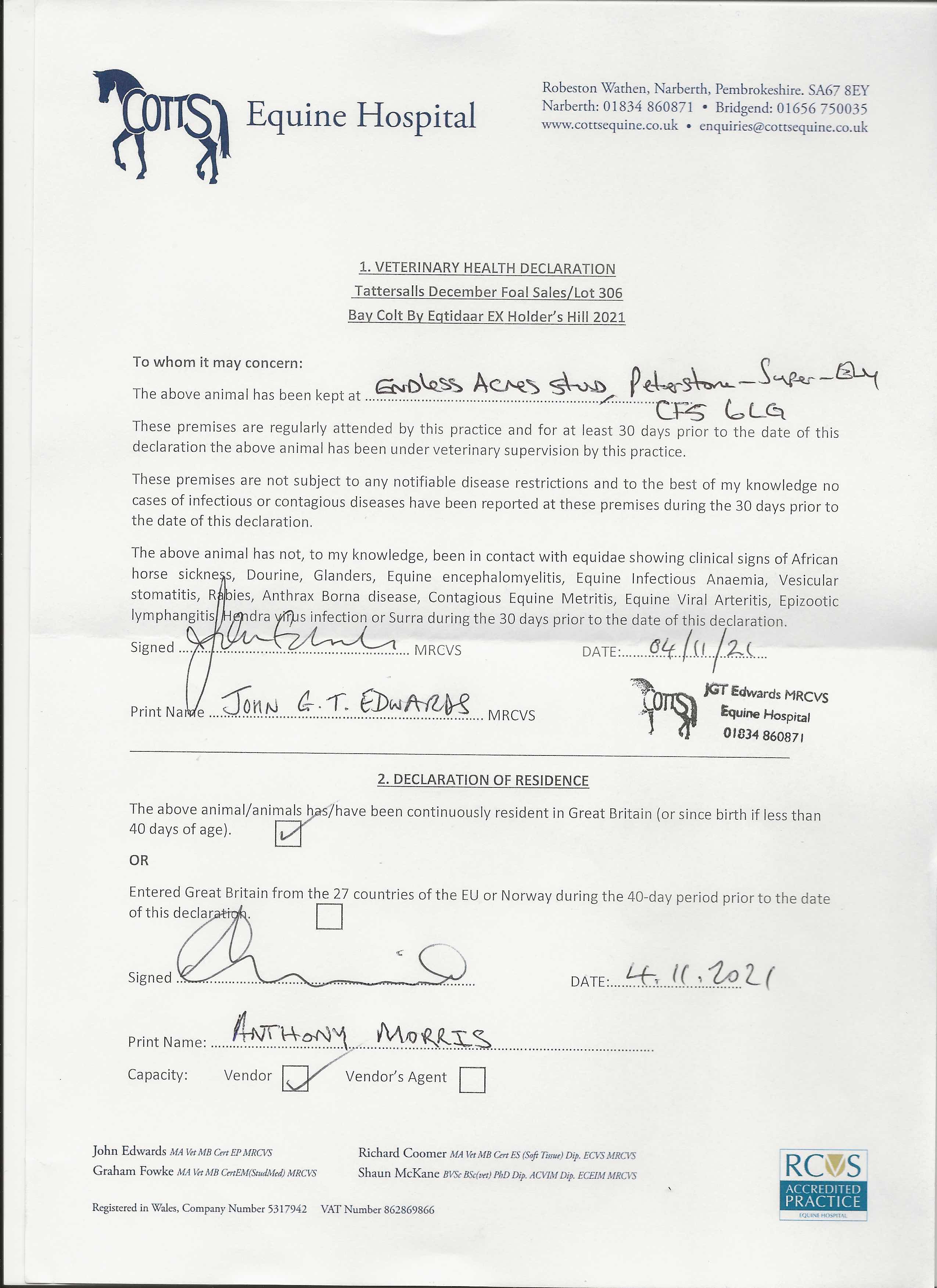Contact: Mr Anthony Morris ✆ 07880543758 ✉ tony@endlessacresstud.co.uk