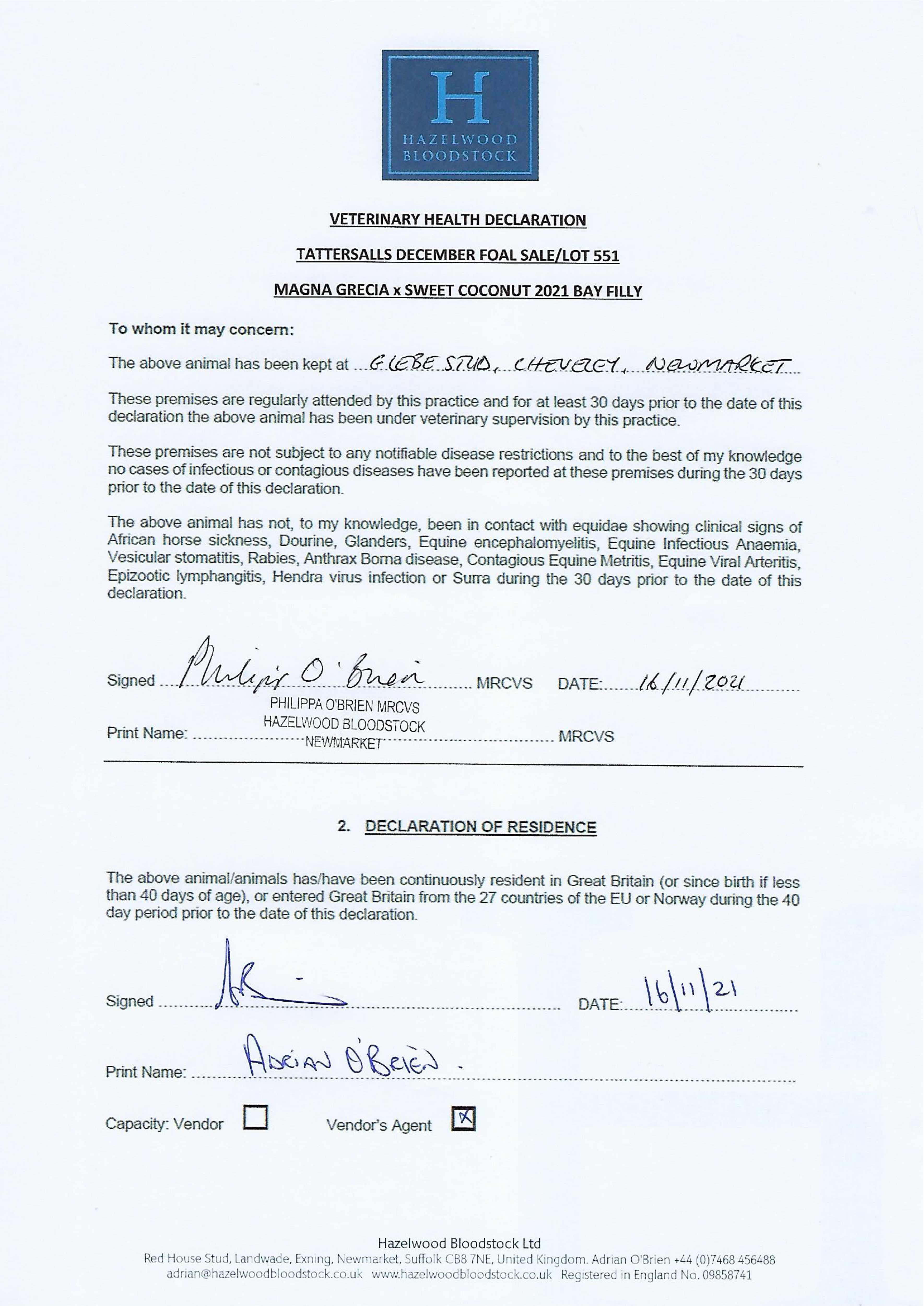 Contact: Adrian O'Brien ✆ +447468456488 ✉ adrian@hazelwoodbloodstock.co.uk