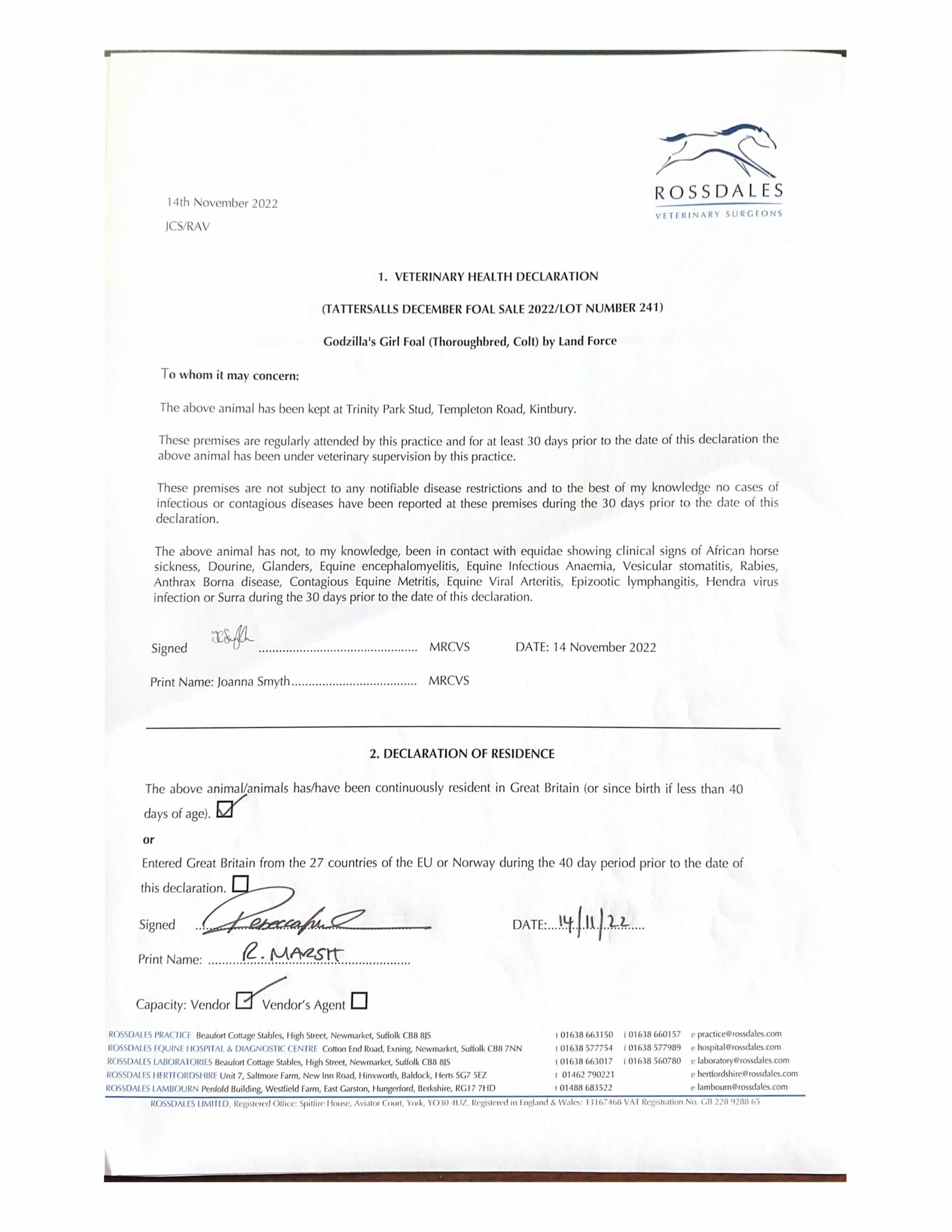 Consignor: Trinity Park Stud
