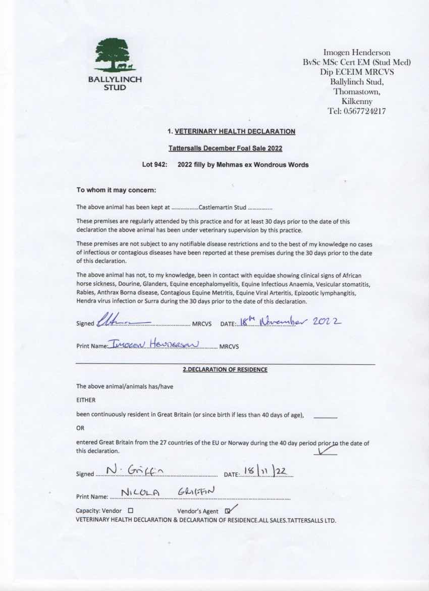Lot 942 Mehmas (IRE) /Wondrous Words (IRE) Ch.F. (IRE)