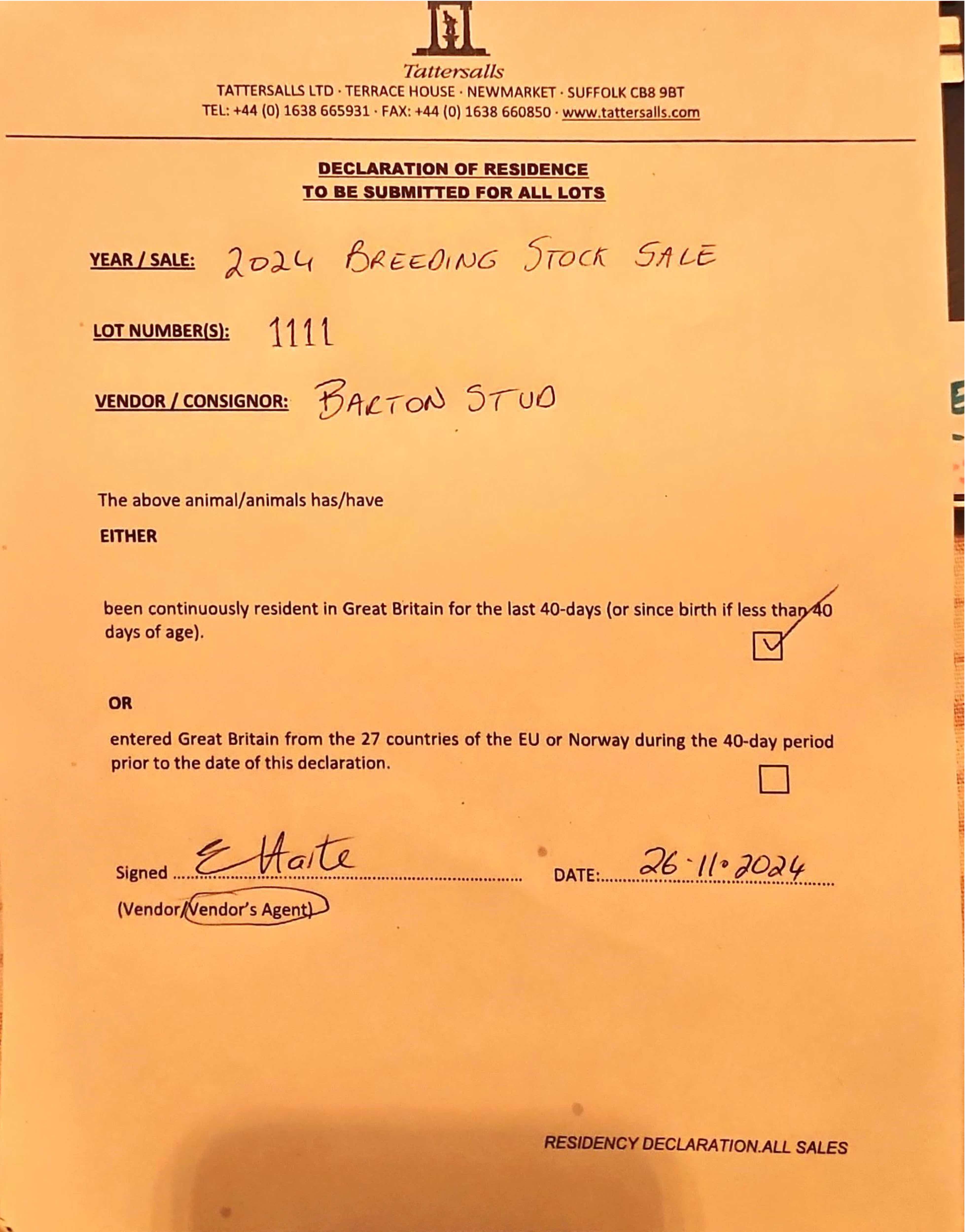 Barton Stud=>Lot Withdrawn