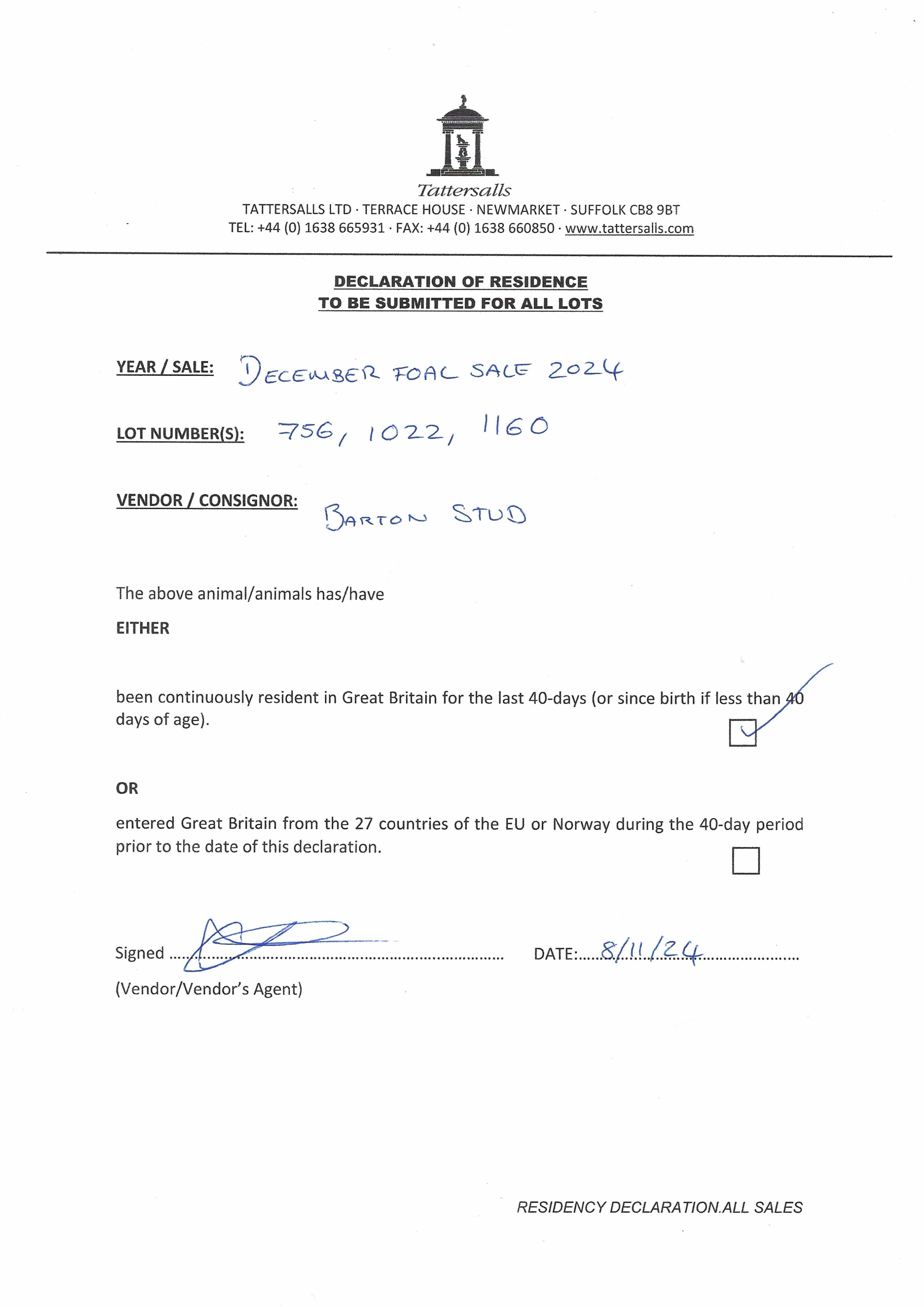 Online Sale - 12th December 2024 lot 82 F. by Arizona (IRE) 2023, Far Westfield Farm=>Vendor 20,000 gns