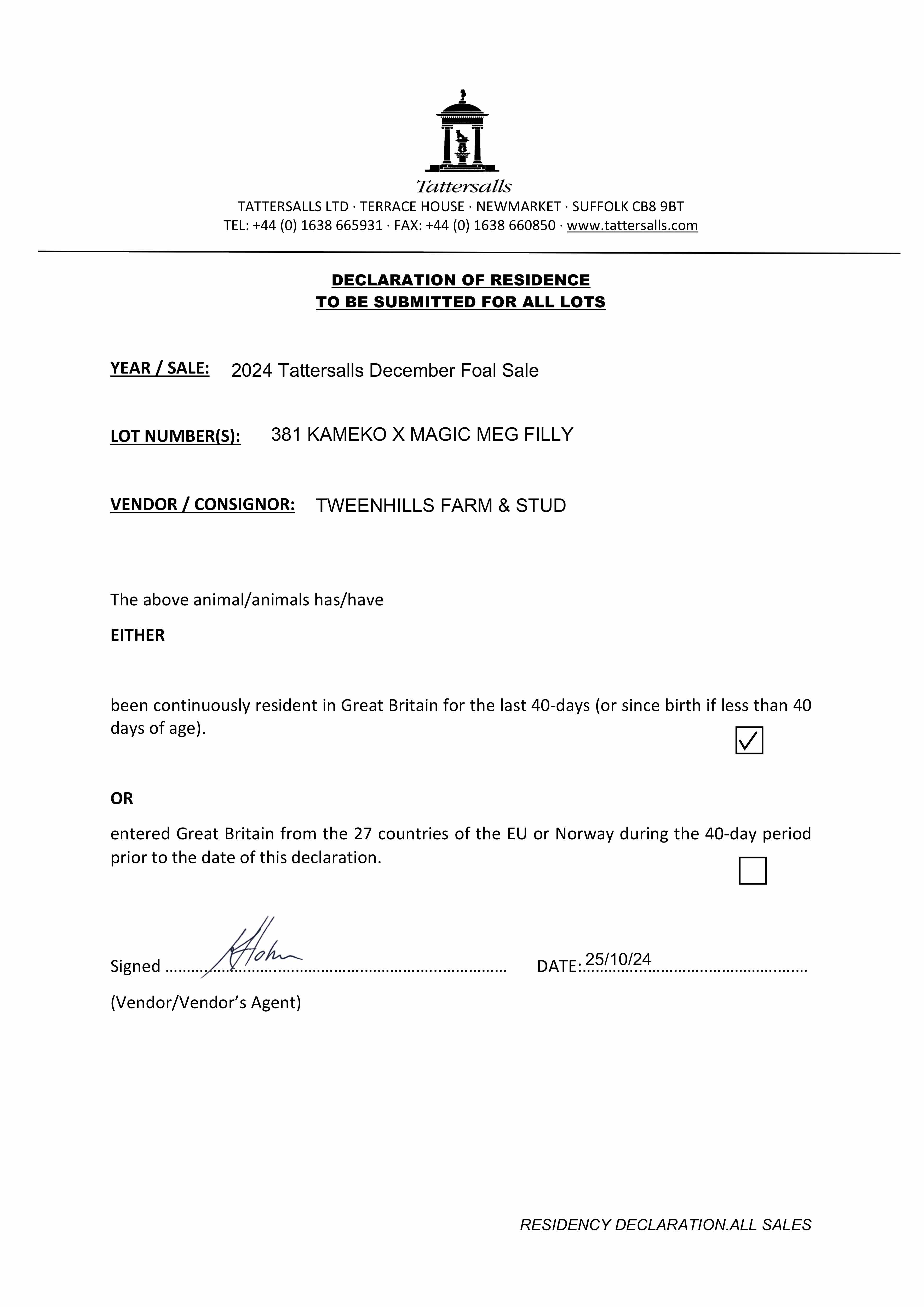 Consignor: Tweenhills Farm & Stud