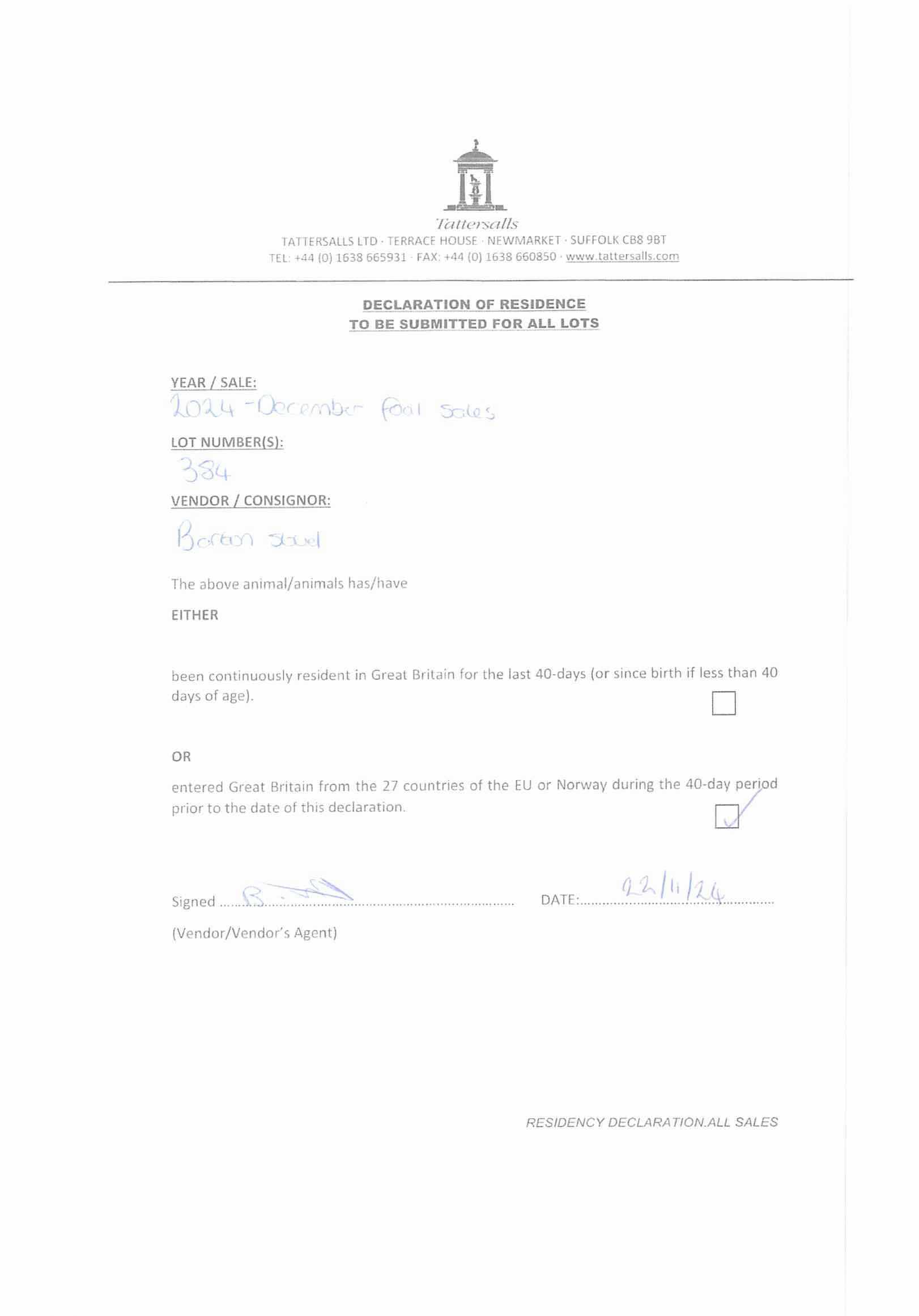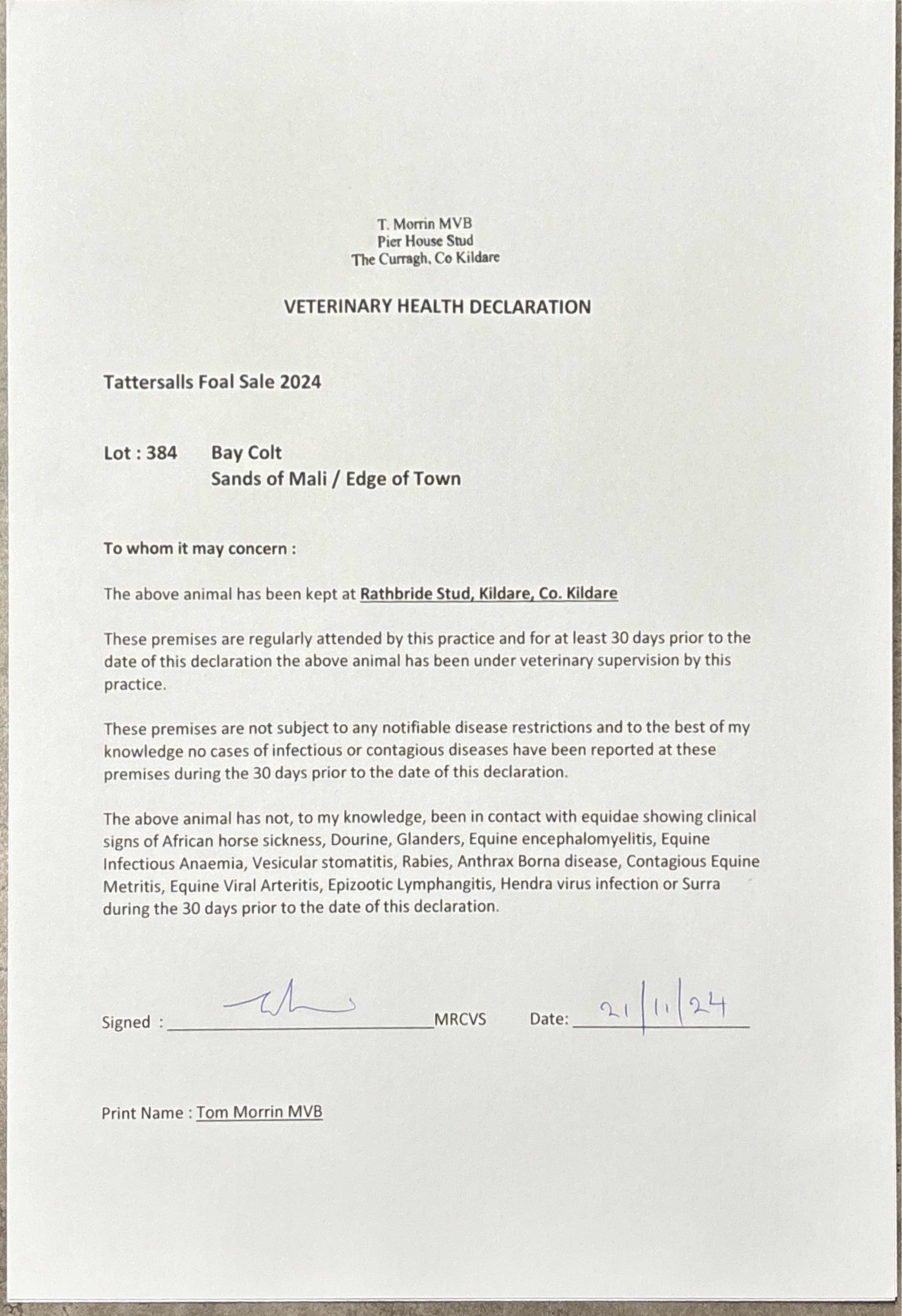 Somerville Yearling Sale 2024 lot 108 F. 2023, Barton Stud=>Vendor 1,000 gns