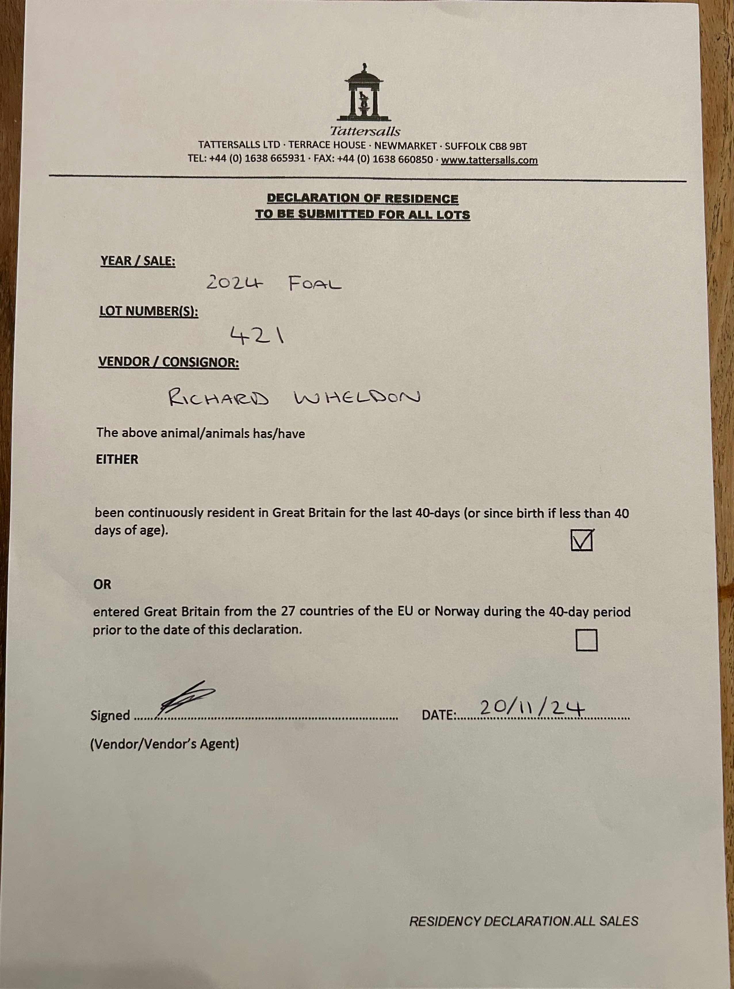 Autumn Yearling Sale 2025 lot 1707, Mr Richard Wheldon=>Vendor 1,000 gns