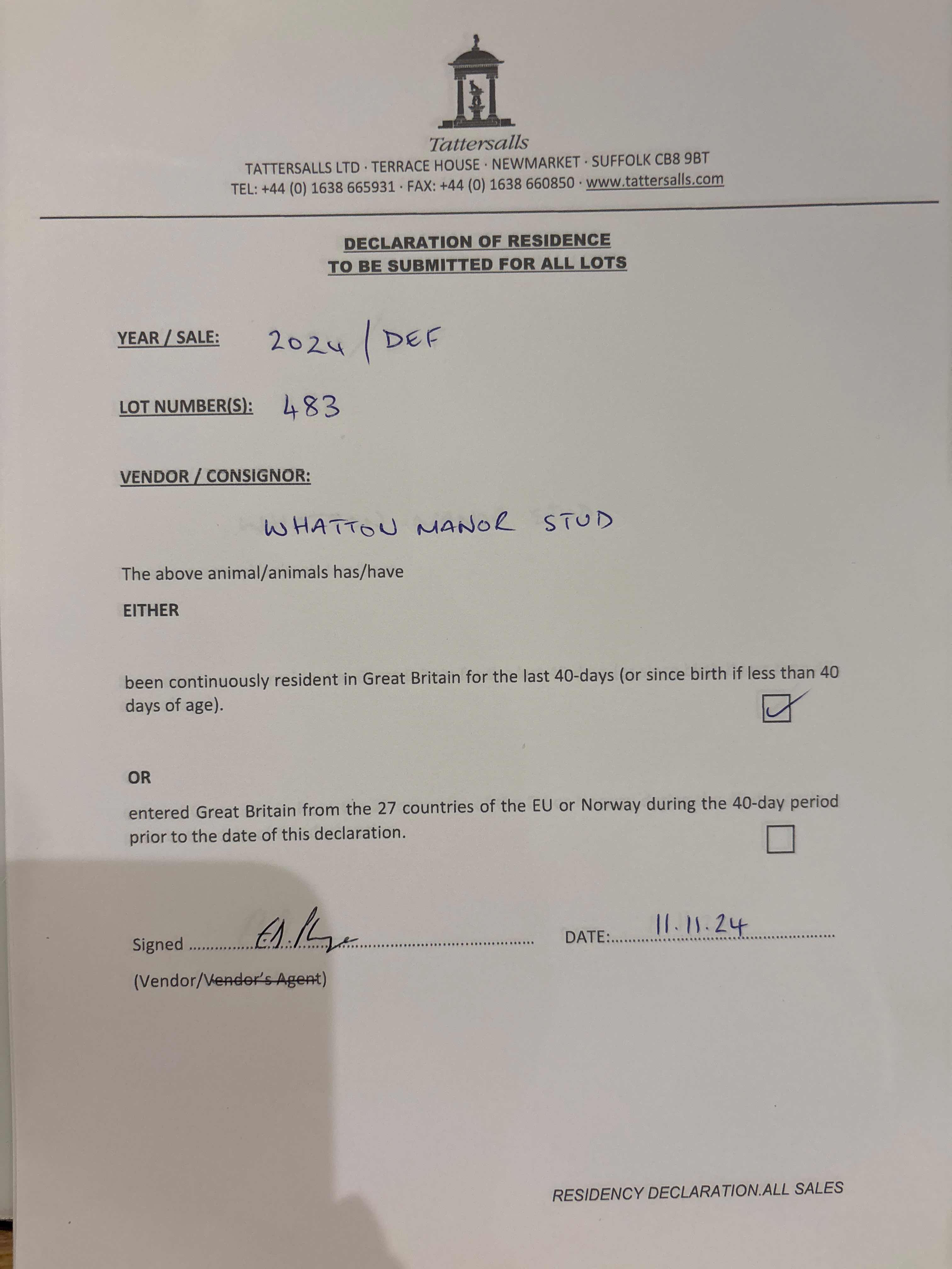 Consignor: Whatton Manor Stud