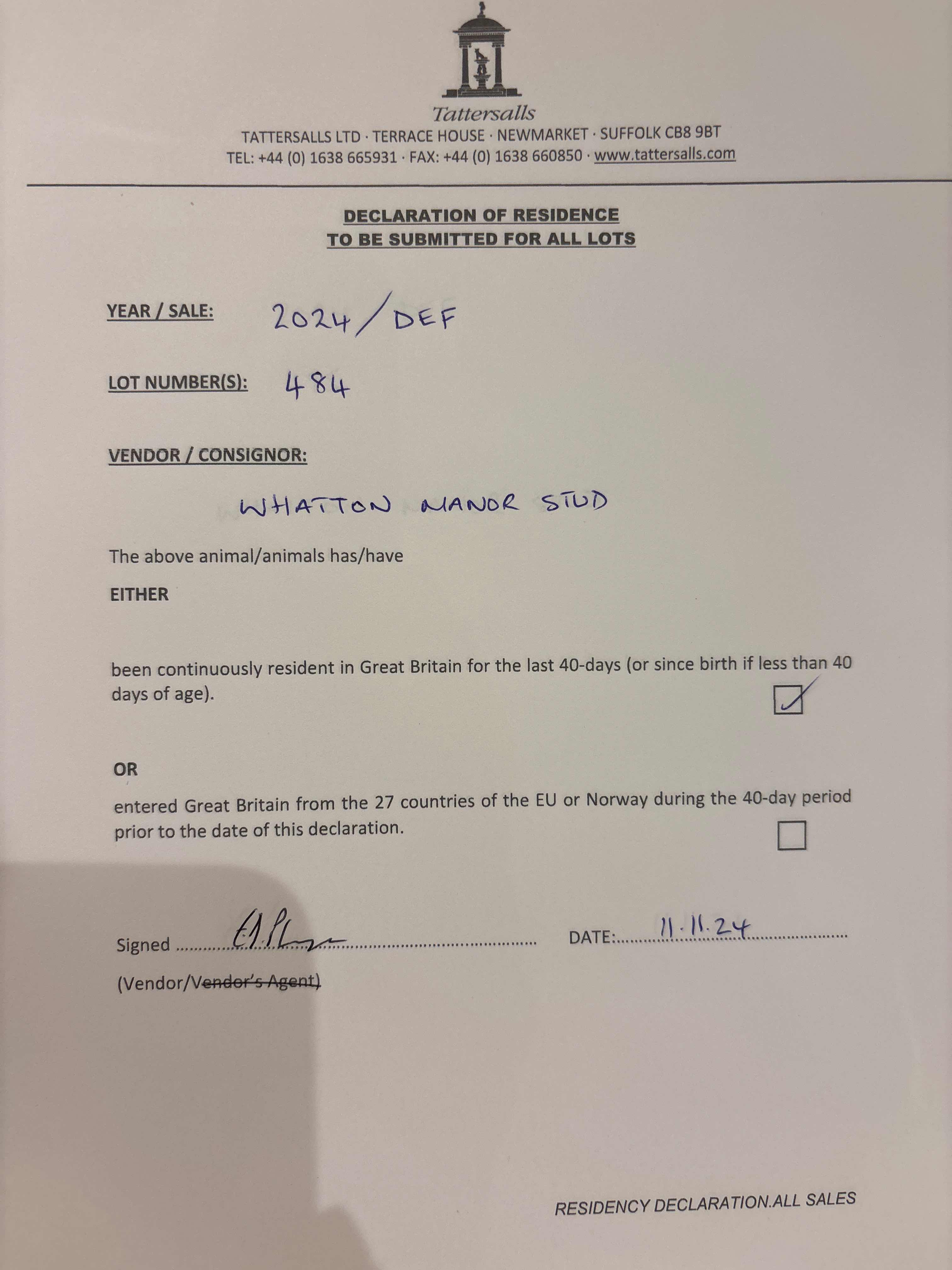 Consignor: Whatton Manor Stud