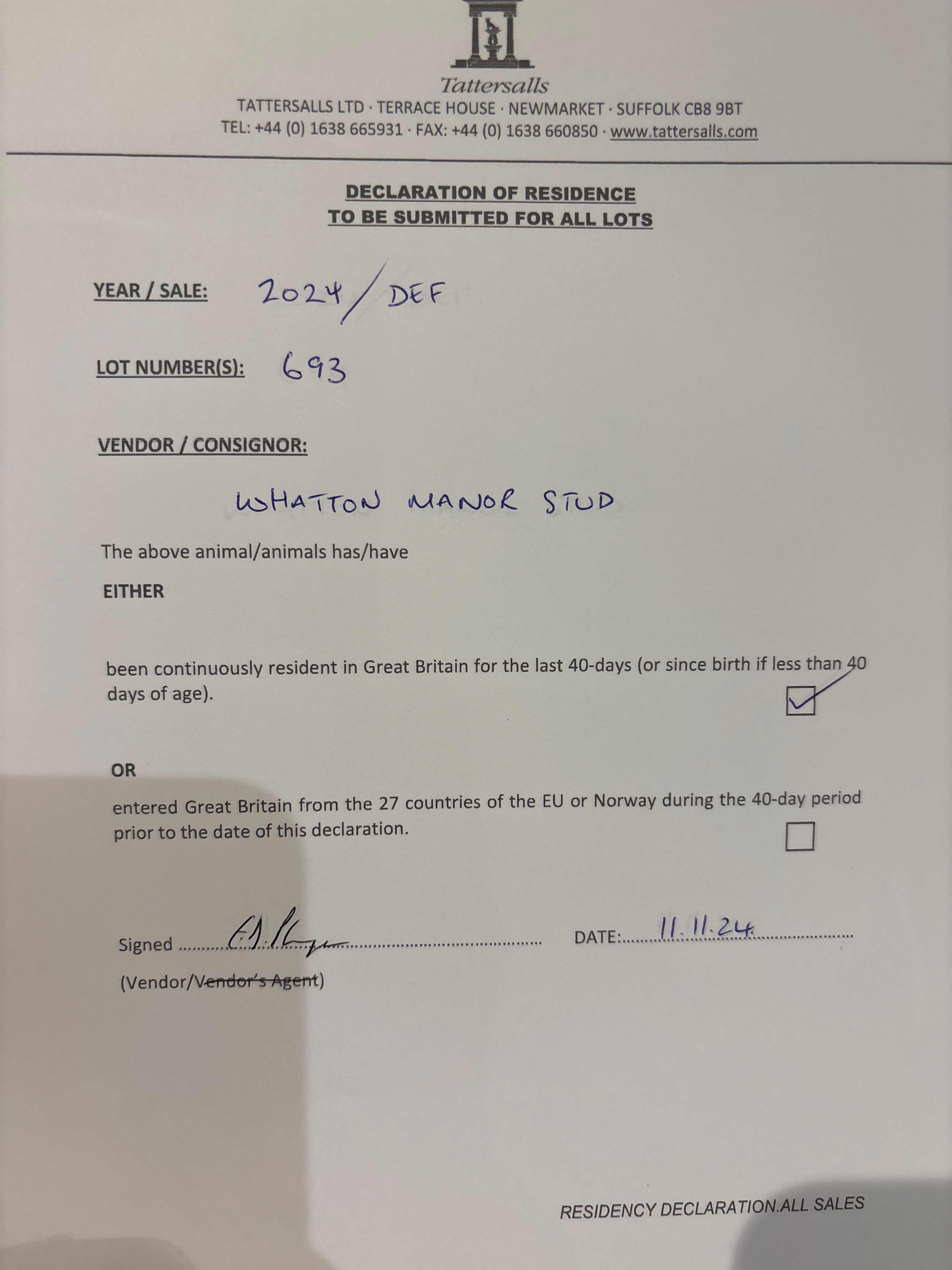 Consignor: Whatton Manor Stud