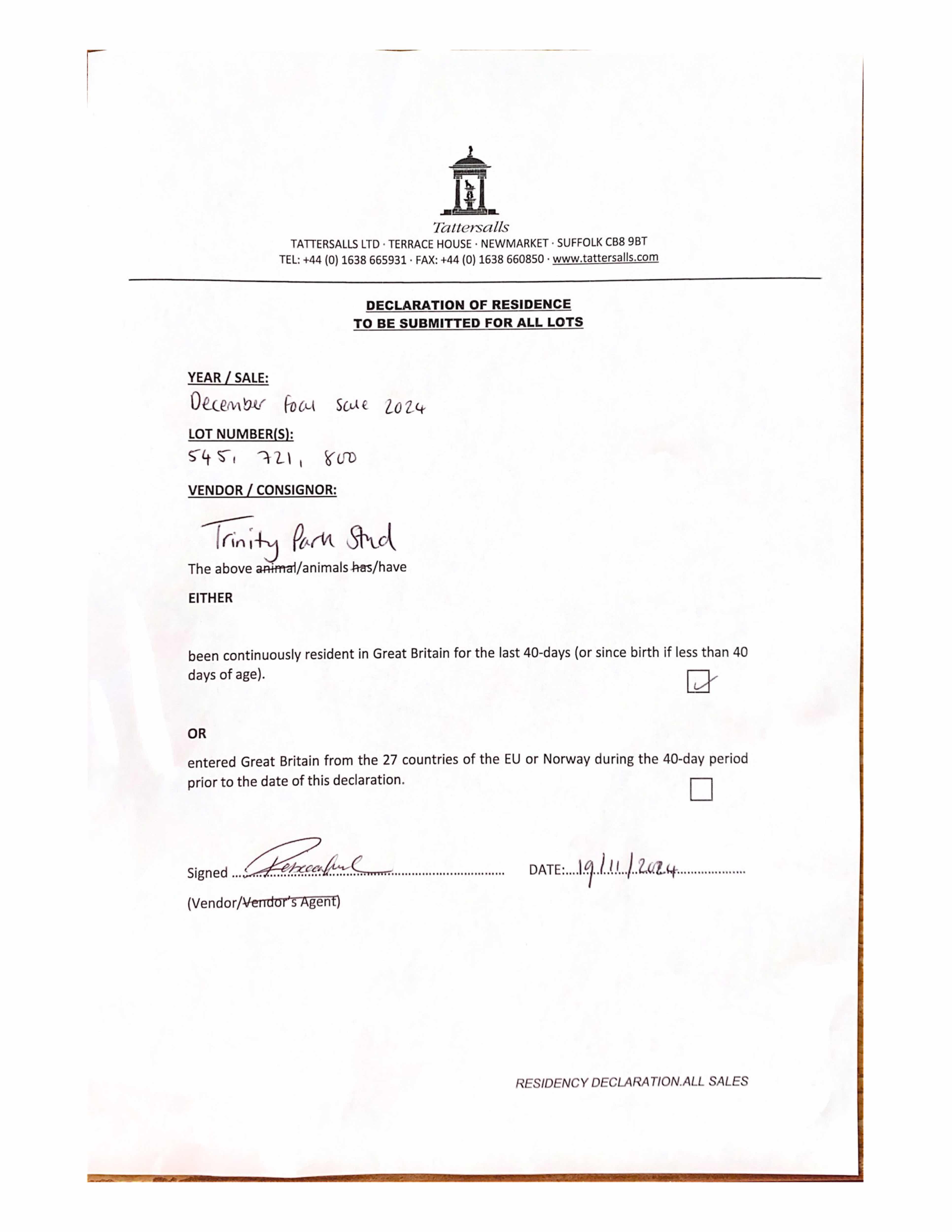 Consignor: Trinity Park Stud