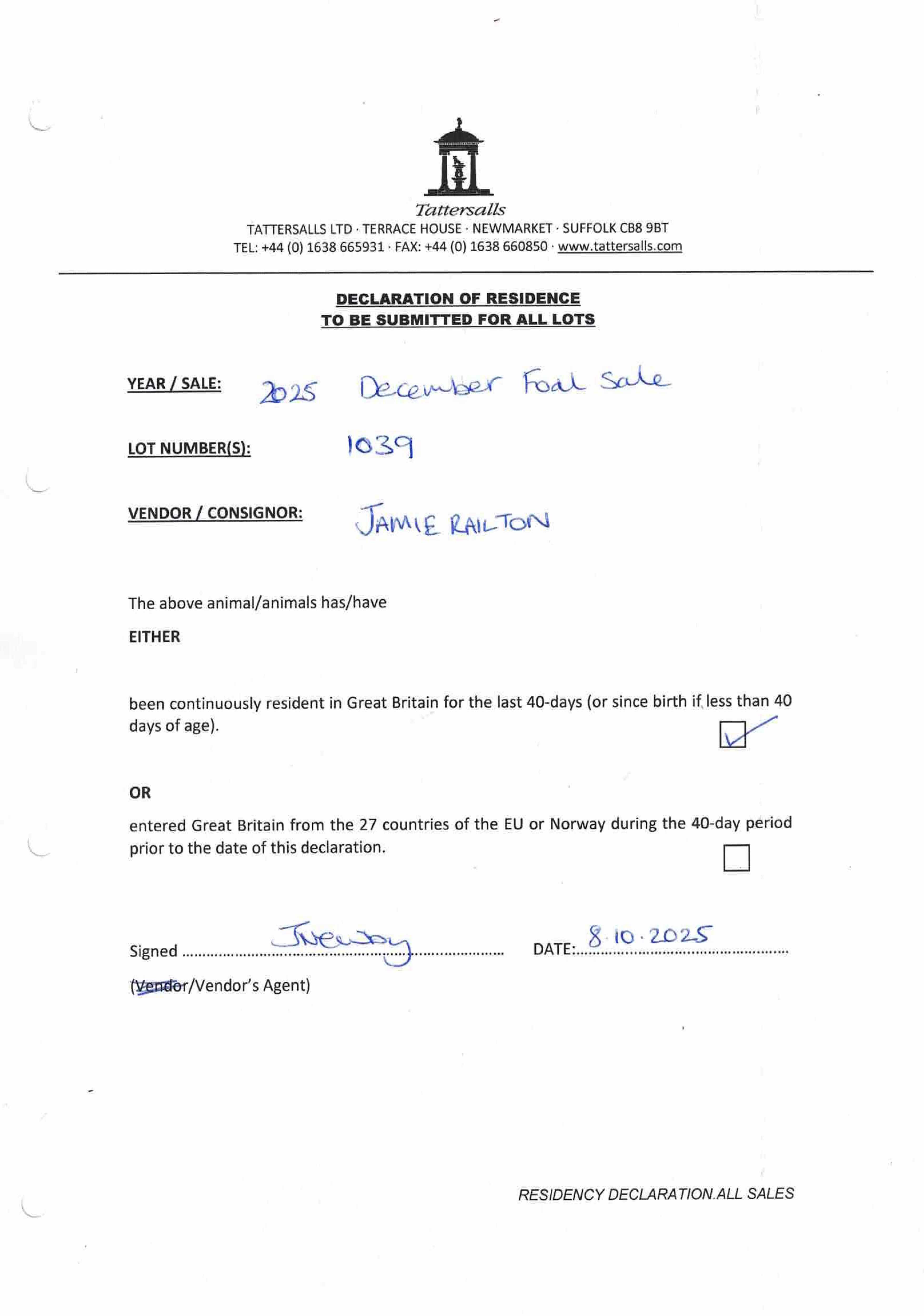Consignor: Jamie Railton (Agent)