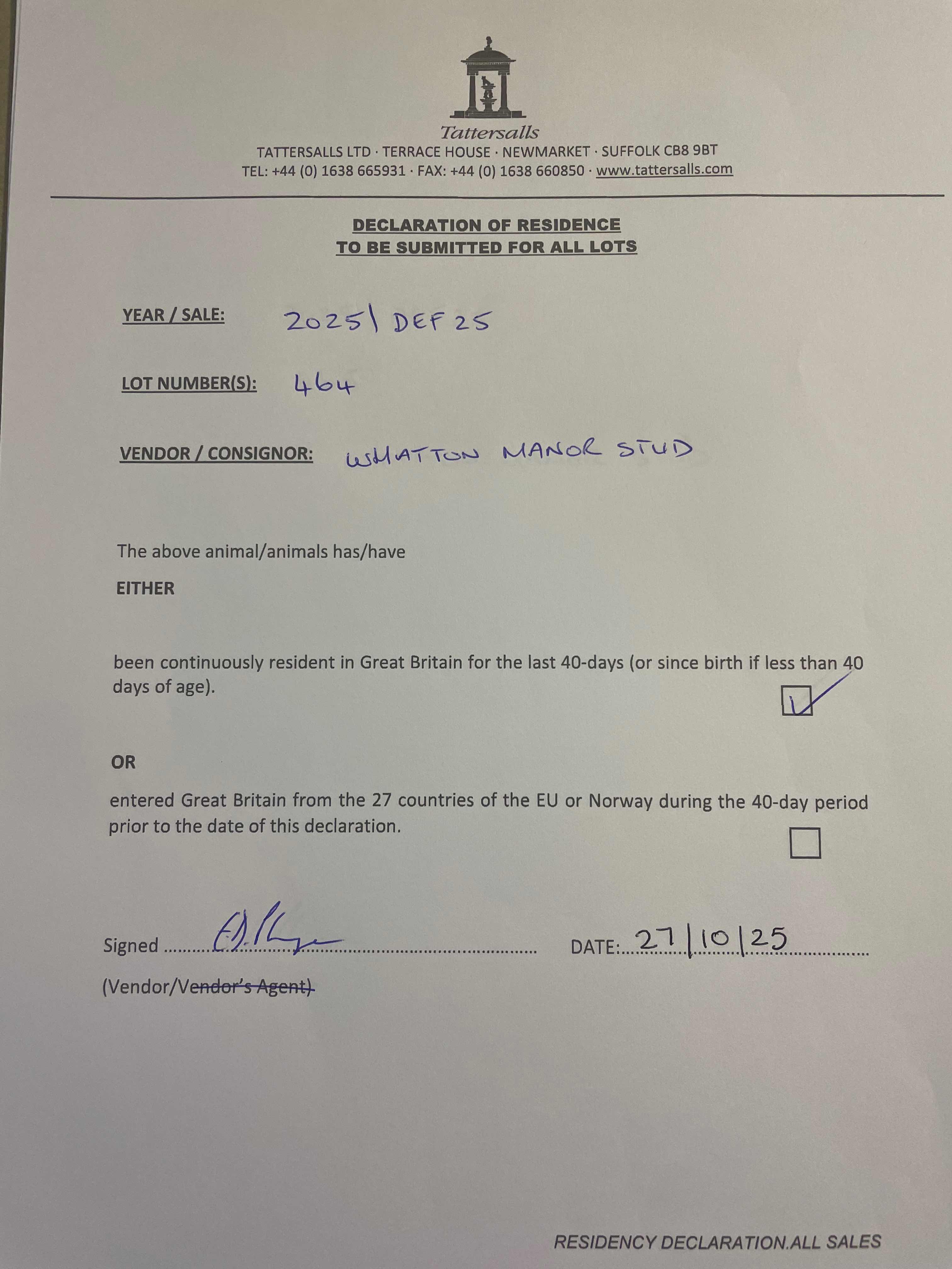 Consignor: Whatton Manor Stud