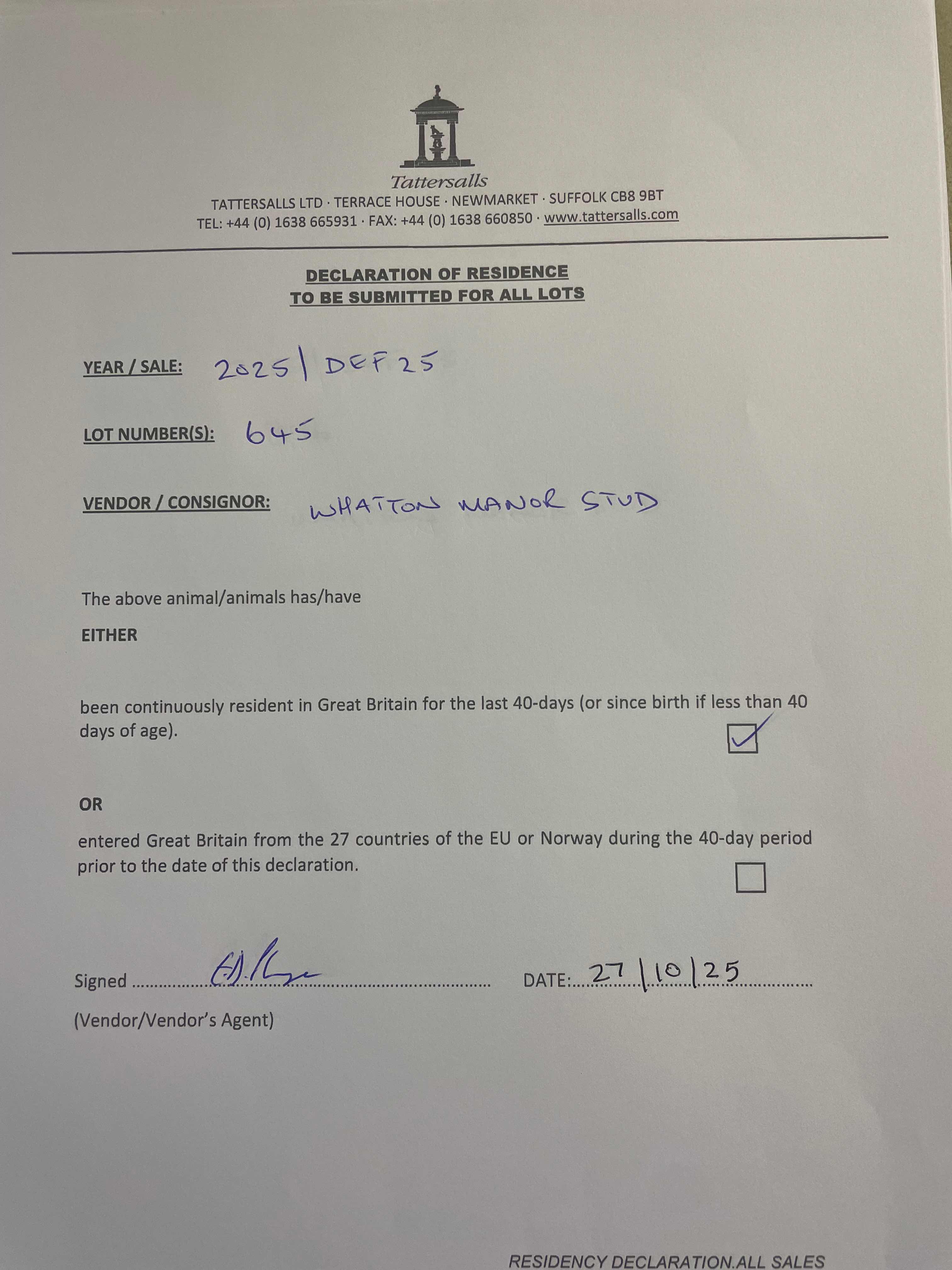 Consignor: Whatton Manor Stud